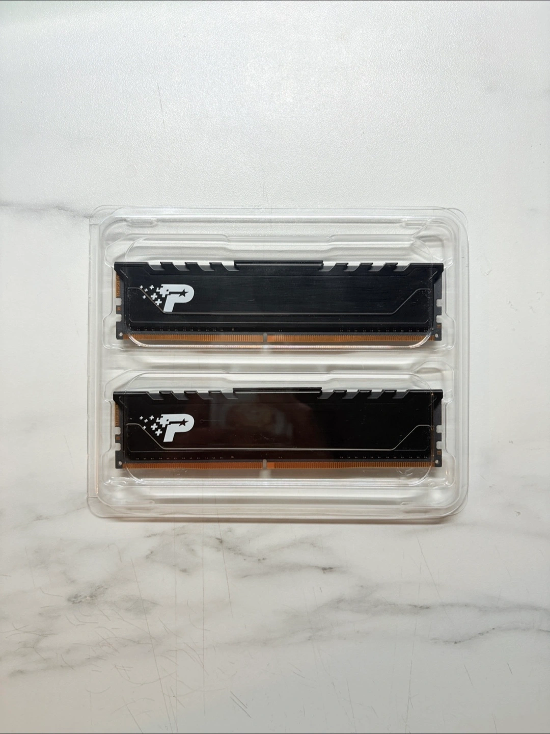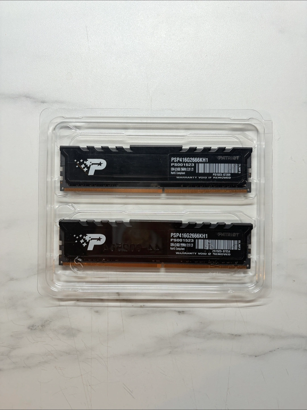 Selling used Patriot DDR4 16GB (2x8GB) 2666MHz CL19 1.2V RAM kit. No longer have original packaging. Model number is PSP416G2666KH1. Perfect for upgrading your desktop!