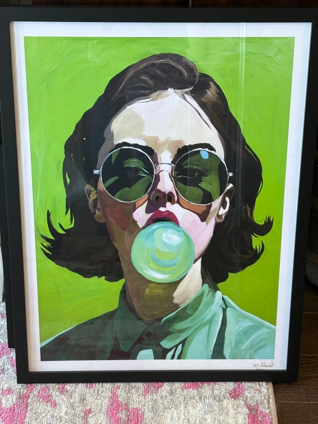 Add a pop of colour to your space with this striking framed art piece, featuring a woman blowing bubblegum. This vibrant print is set in a sleek black frame and is ready to hang.