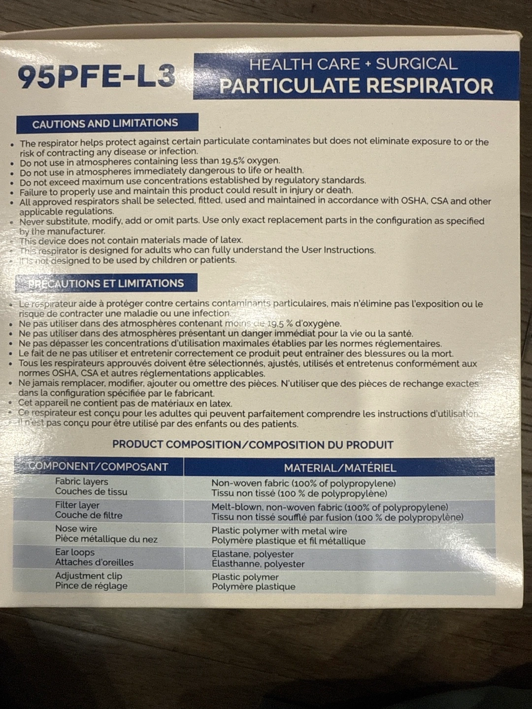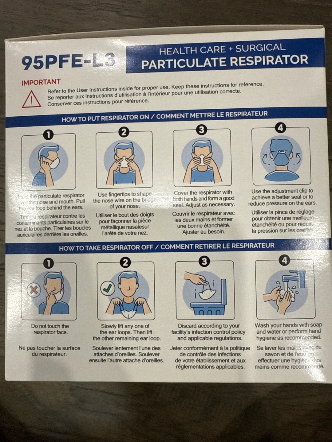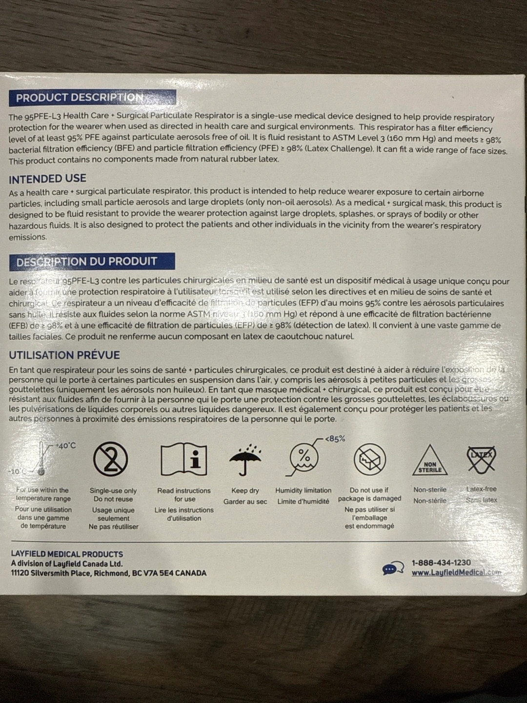 Selling a box of Layfield 95PFE-L3 health care + surgical particulate respirators. The box contains 30 pieces. These are compliant with Health Canada guidance for 95PFE-L3. Cash and pick up. Have a few more boxes too.
