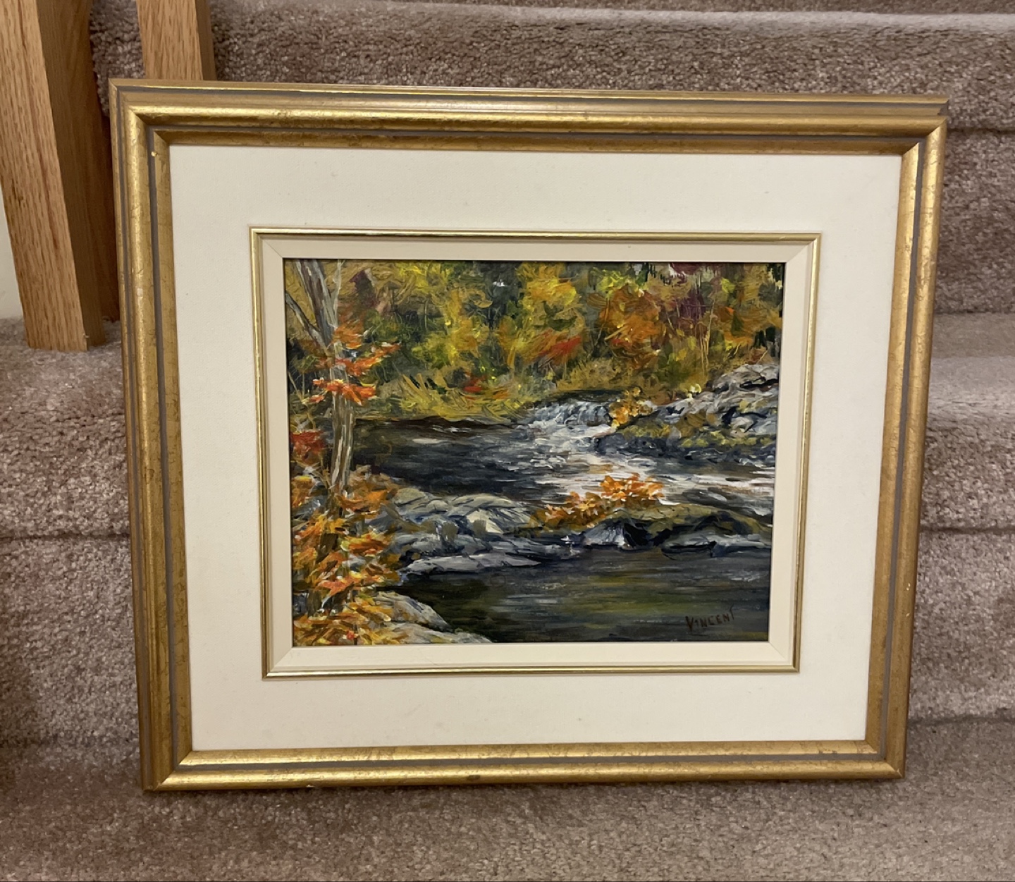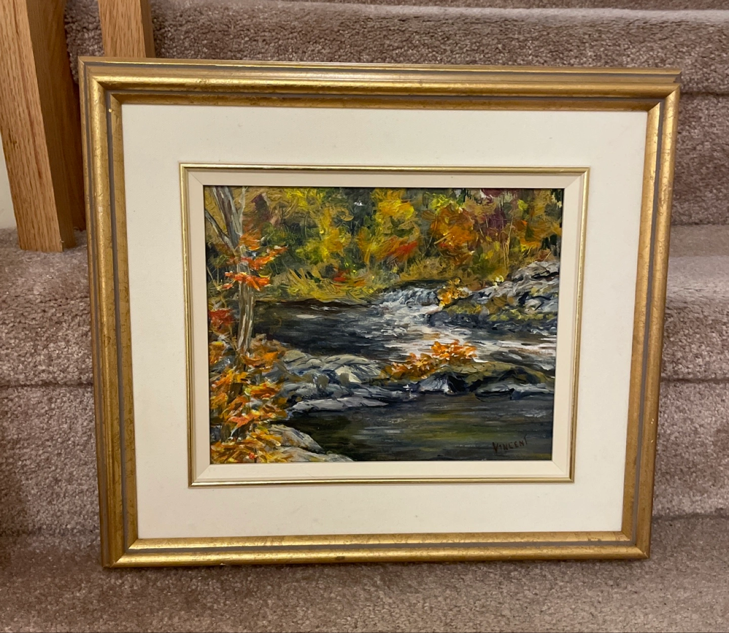 Selling a beautiful framed acrylic painting by Bill Vincent! The painting is titled 'Falls in Fall' and measures 10x8. It's in great condition and would look lovely in any home