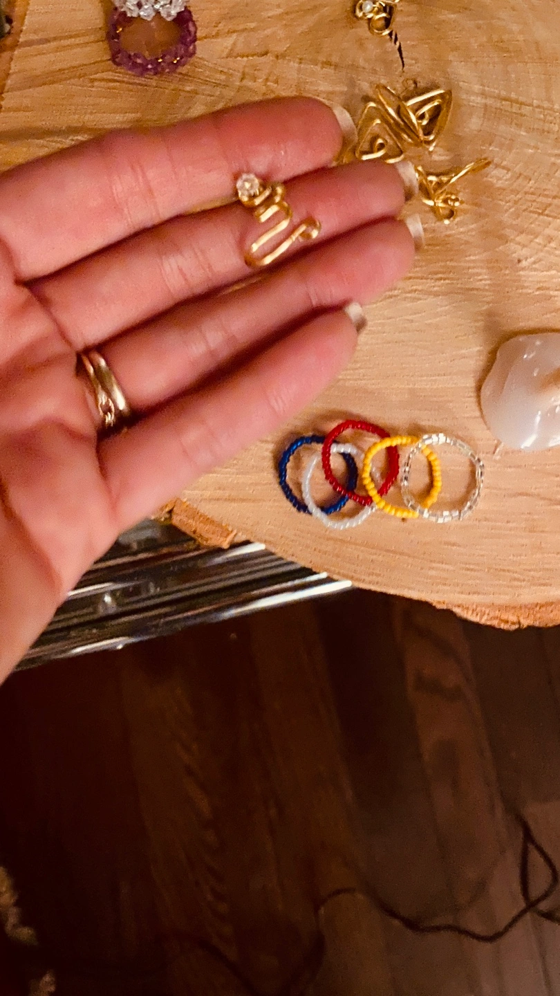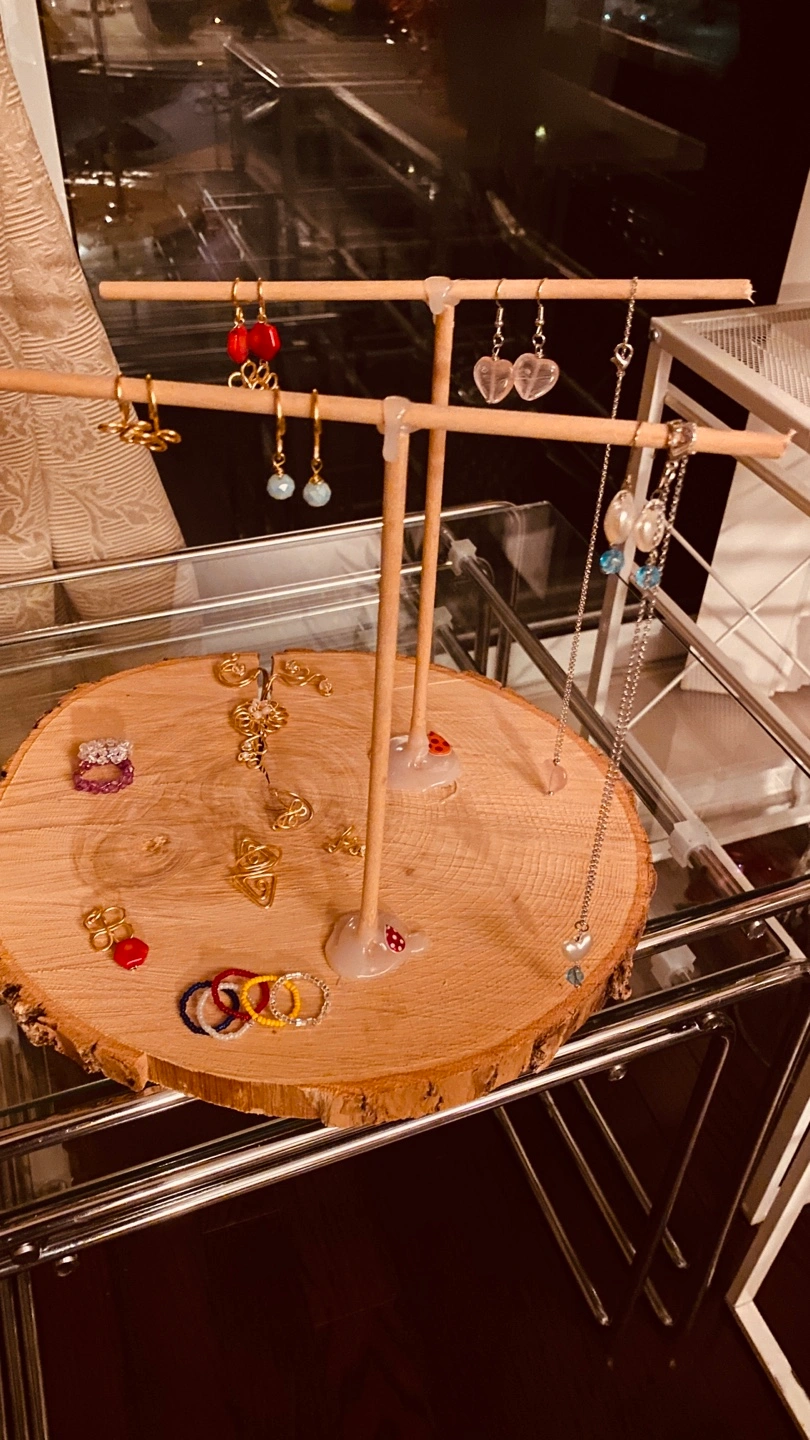 A collection of assorted handmade jewellery pieces! There are rings, earrings, and necklaces, all unique and crafted with care. Perfect for adding a personal touch to any outfit!