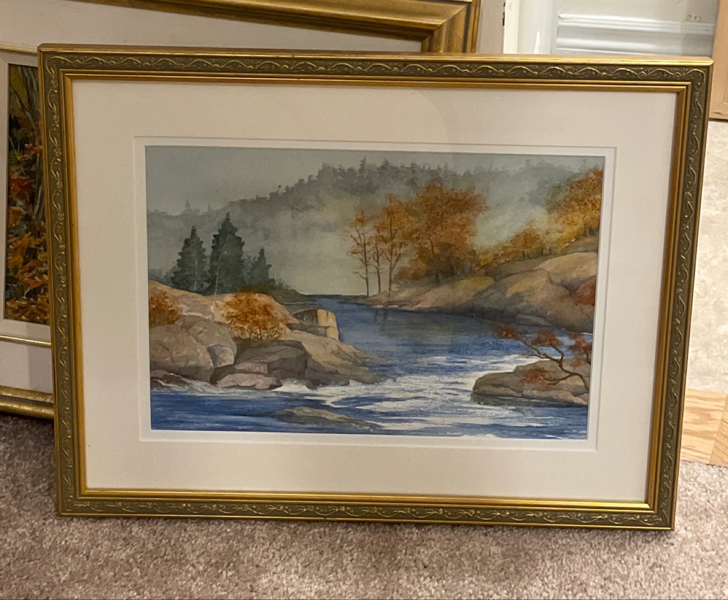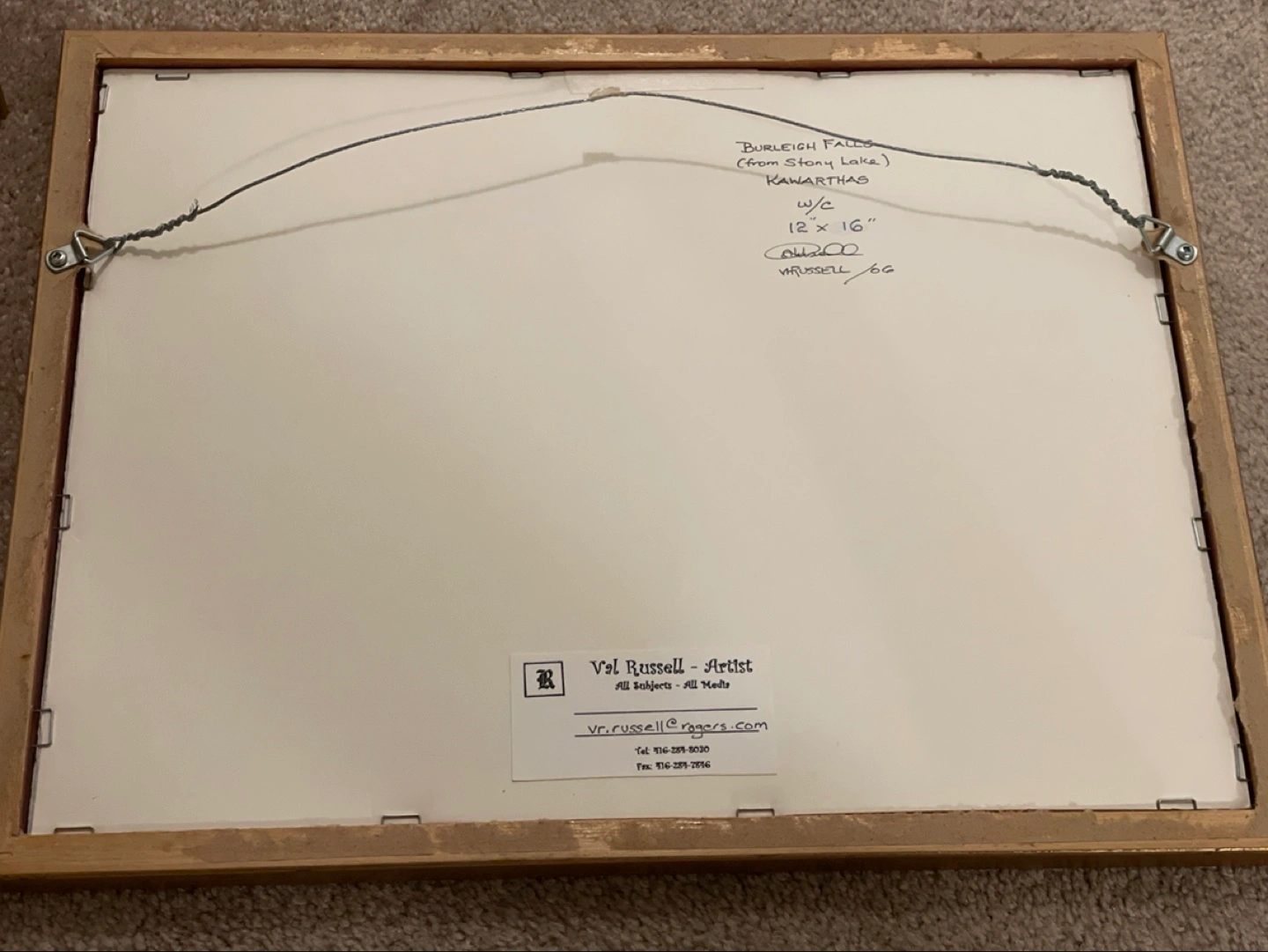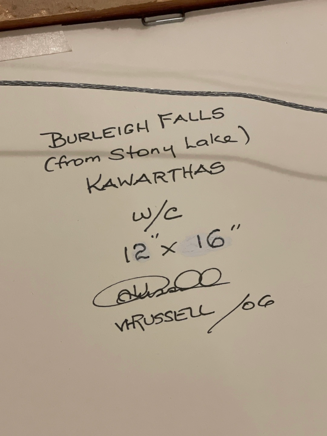 Selling a framed Val Russell painting titled "Burleigh Falls (from Stony Lake) Kawarthas". It's a watercolour piece with dimensions of 12" x 16". Signed by VRussell '06