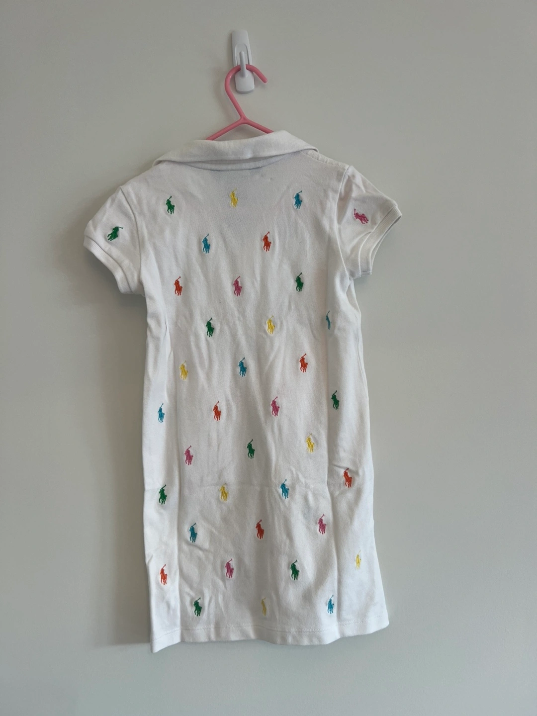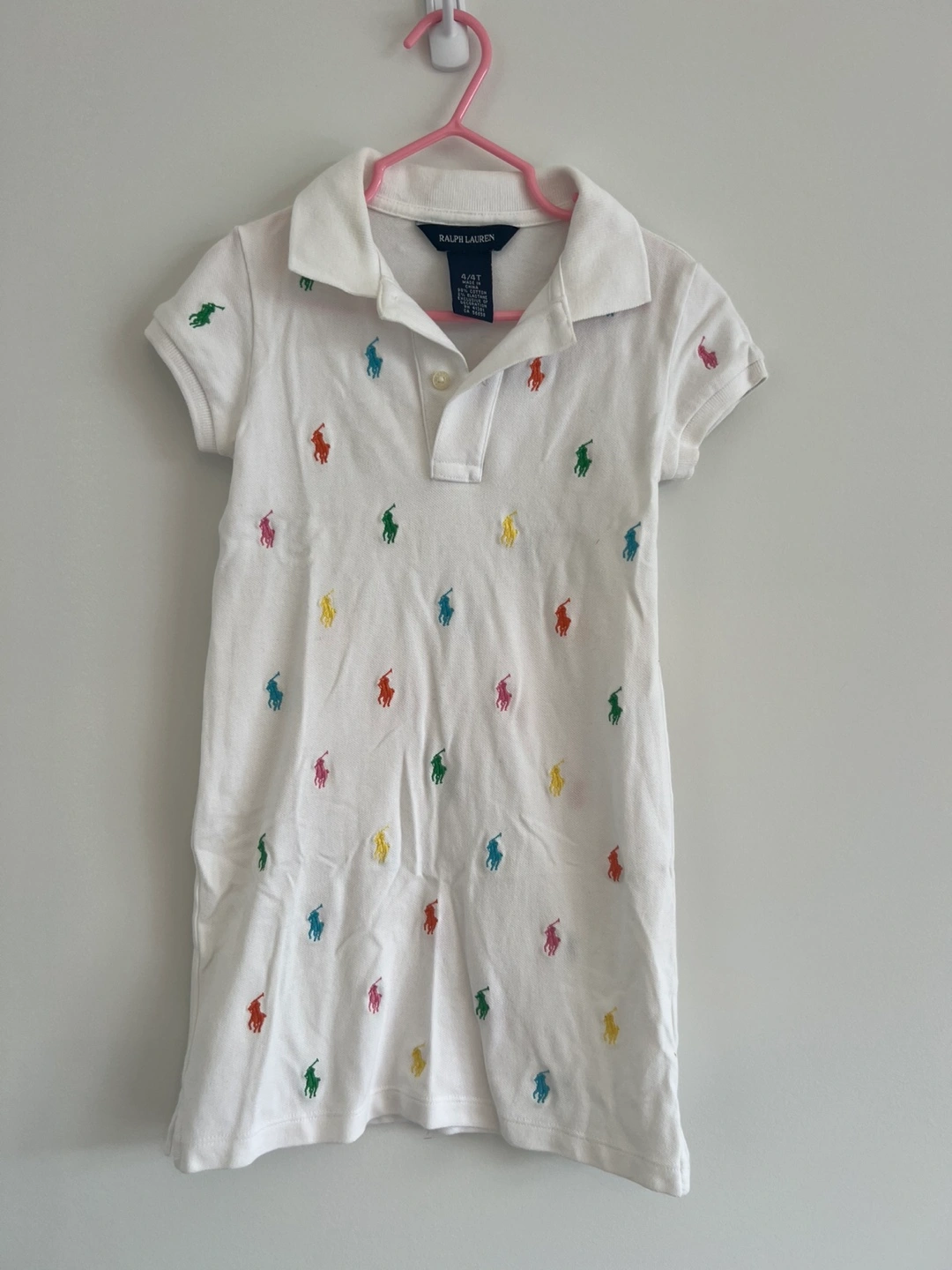 This adorable Ralph Lauren polo dress is perfect for your little one! It's a size 4/4T and features a classic white colour with colourful polo player logos all over. Made from 98% cotton and 2% elastane, it's comfy and easy to wear for any occasion