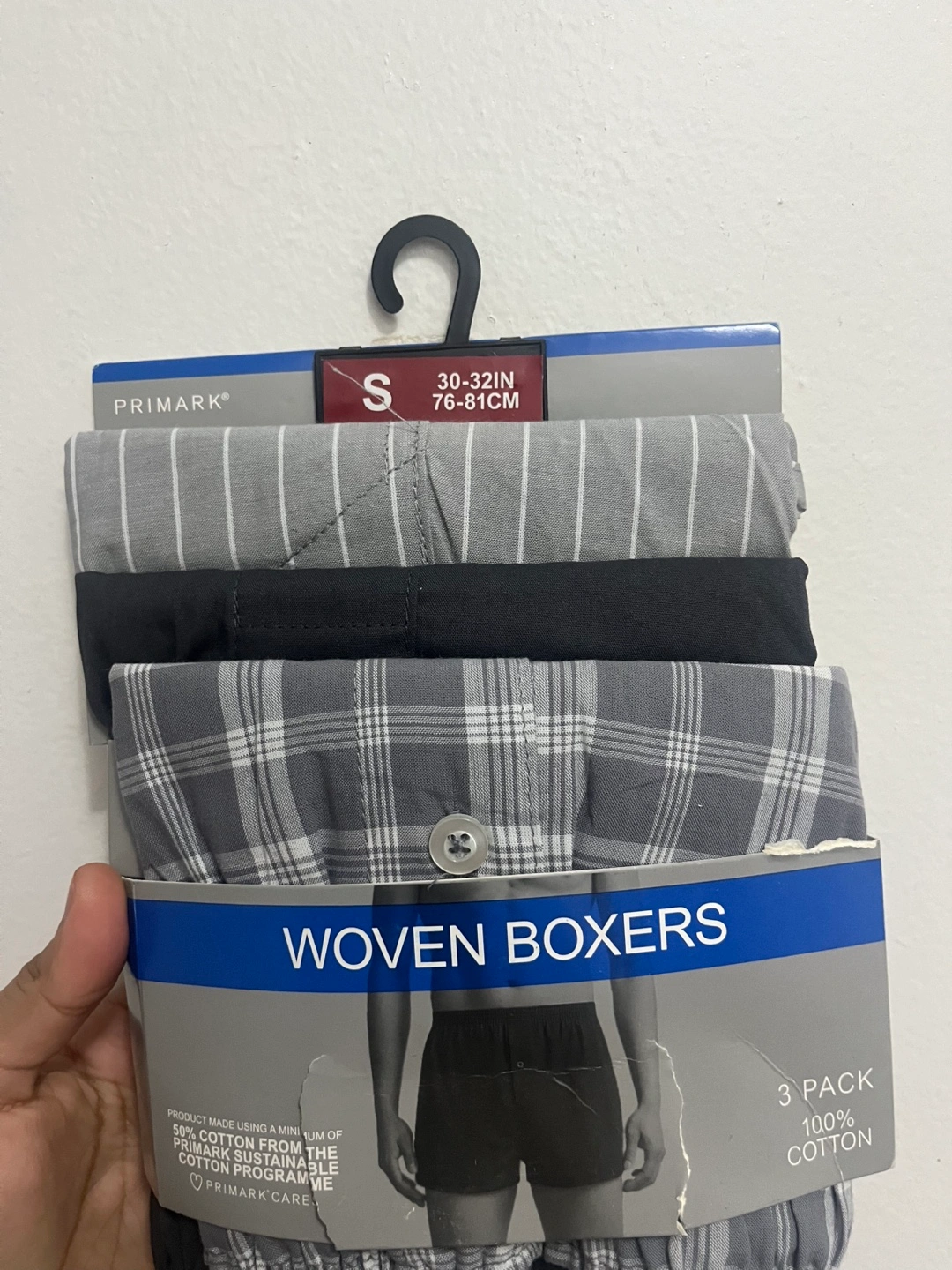 Selling a 3-pack of Primark woven boxers in size small (30-32 inches / 76-81 cm) They are made with 100% cotton from Primark's sustainable cotton program.