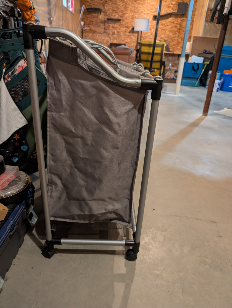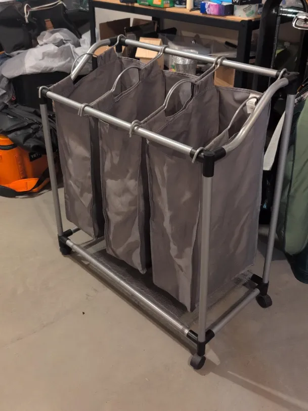 Here's a handy triple laundry sorter cart! It's great for keeping your whites, darks, and colours separate. It also has wheels so you can easily move it around your laundry room or closet. It's in good condition and ready for a new home