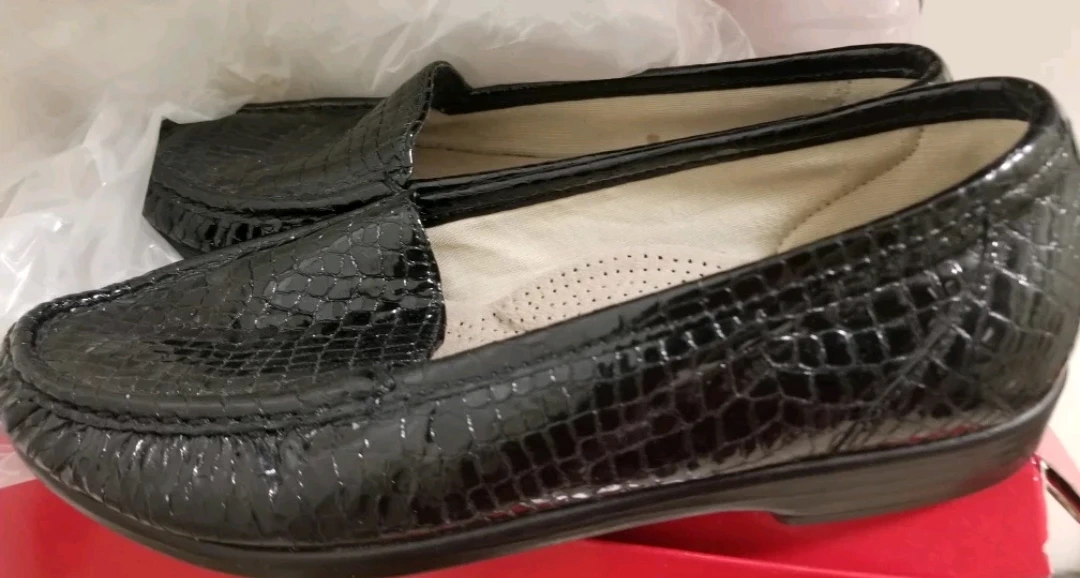 These are a pair of SAS loafers in black. They feature a unique reptile-like texture. They like new condition, worn 2-3 times