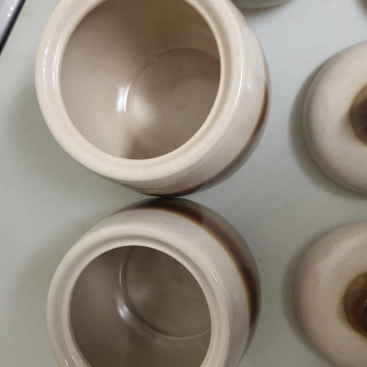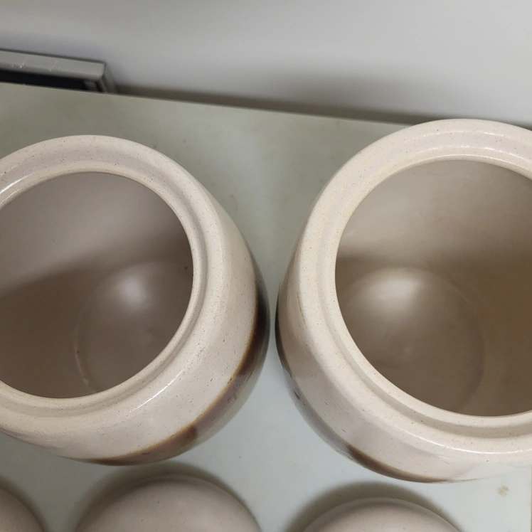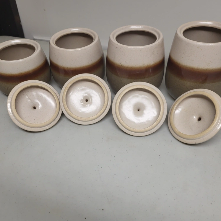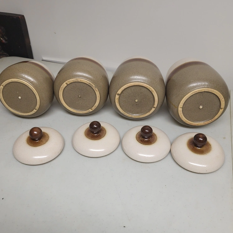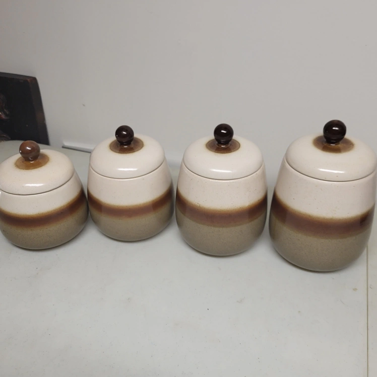 Here's a set of four vintage ceramic canisters! They have a lovely two-tone design with a brown stripe around the base and a cream-colored top. Each canister comes with its own lid, complete with a dark brown knob. Perfect for adding a touch of retro charm to your kitchen!
