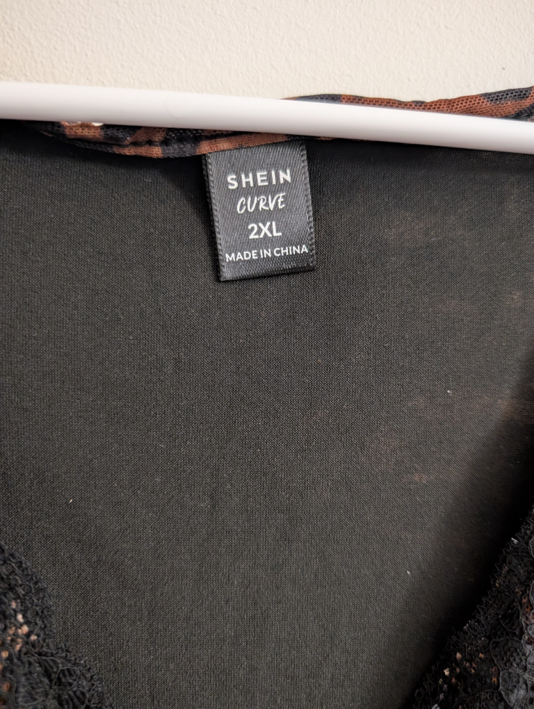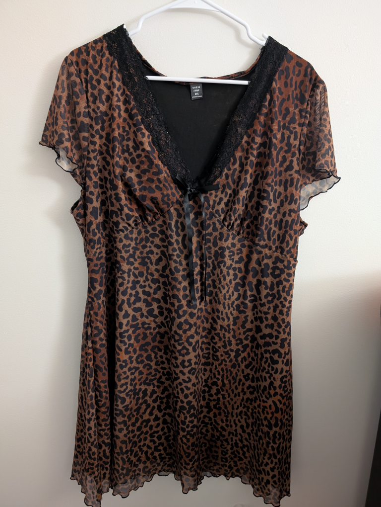 Selling a Shein Curve dress in size 2XL! It features a fun leopard print with black lace detailing. The dress is made of 95% polyester and 5% elastane.