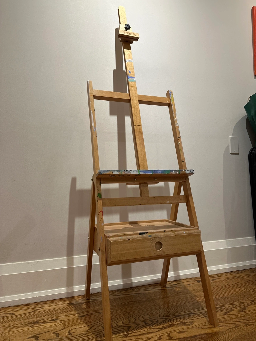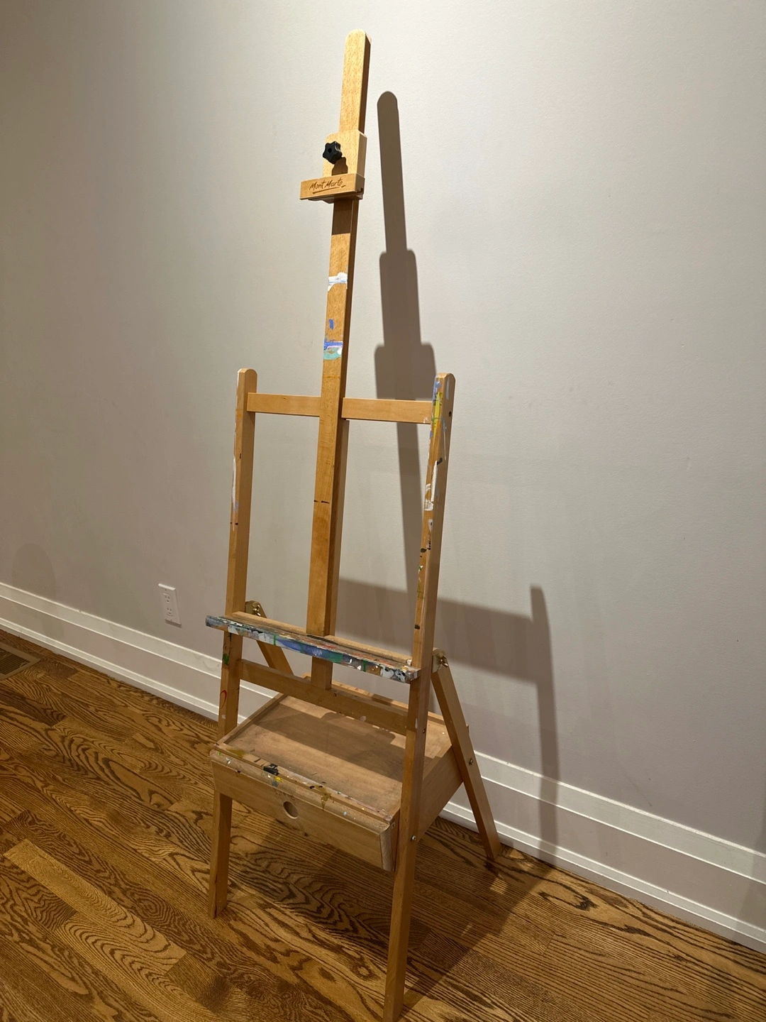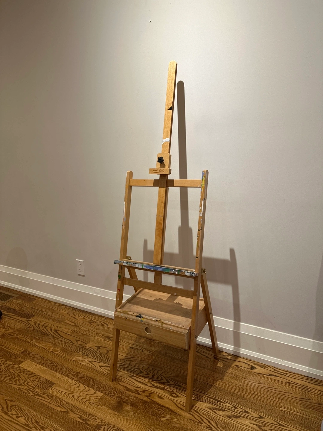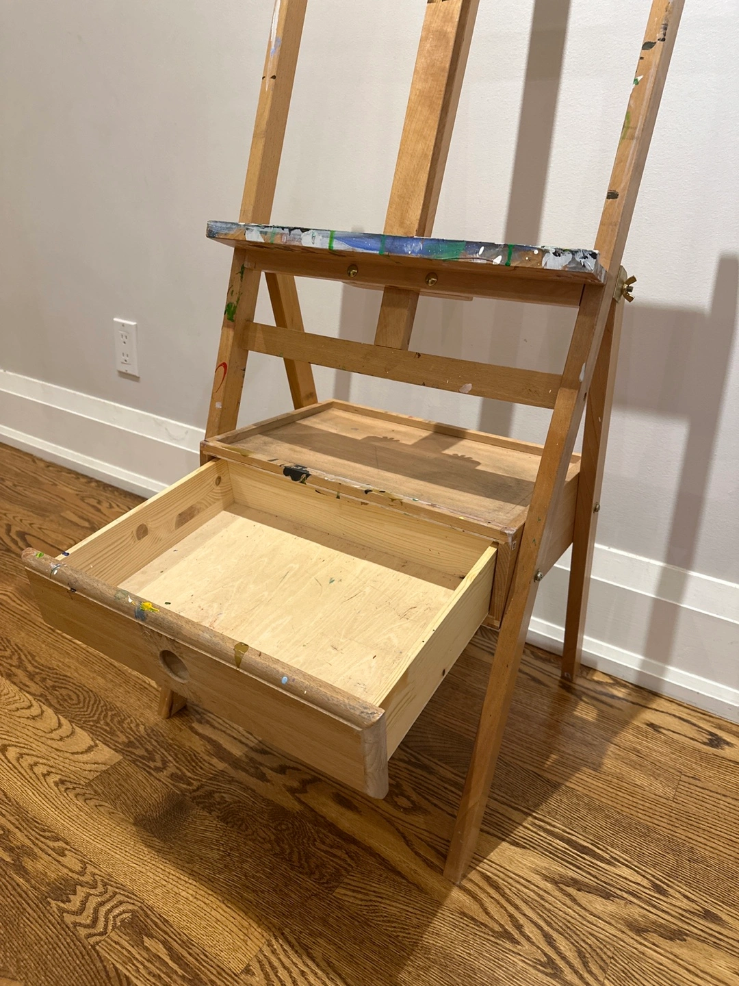 Selling a used wooden artist easel. It has a handy drawer for storing your paints and brushes. There are some paint stains, as you can see in the photos, but it's still sturdy and ready for your next masterpiece!
