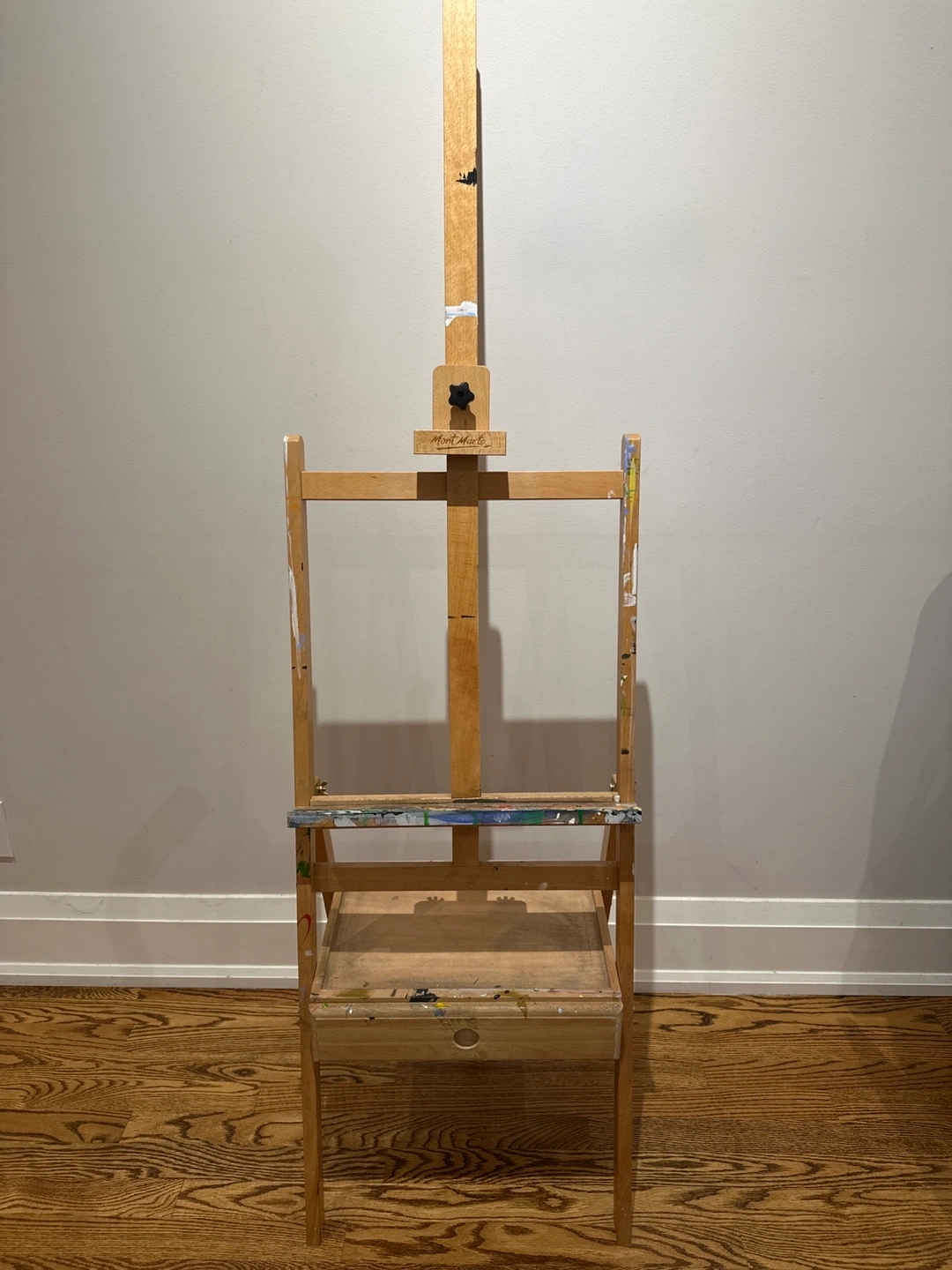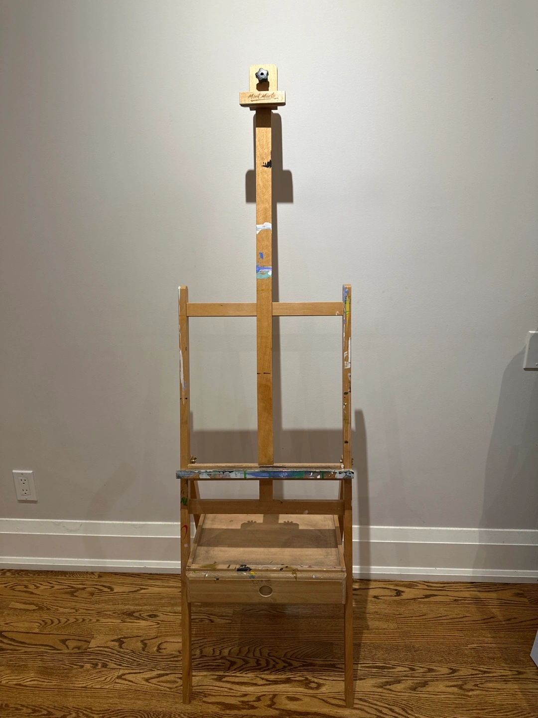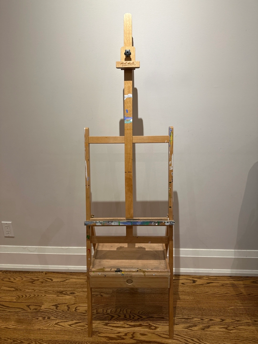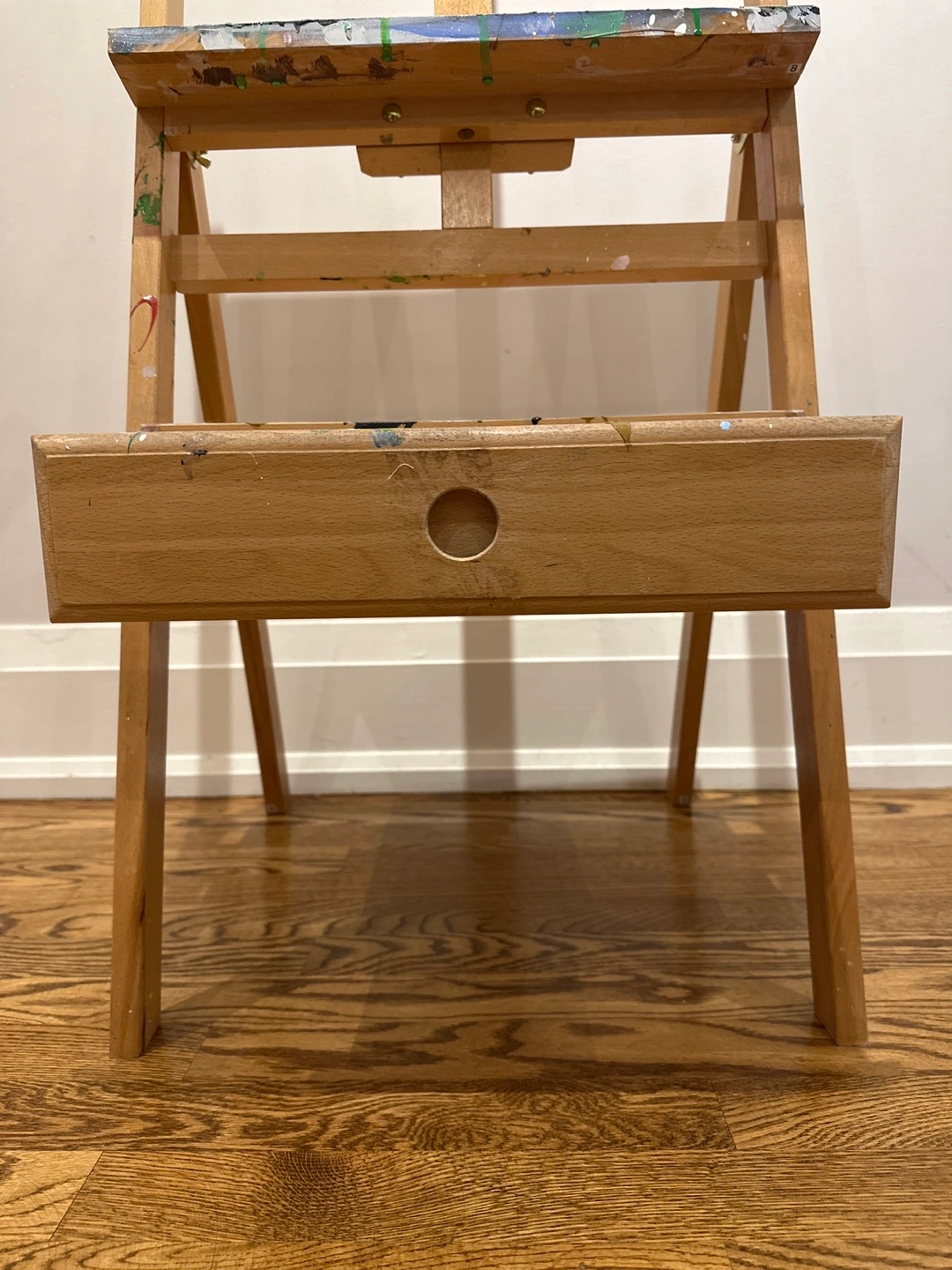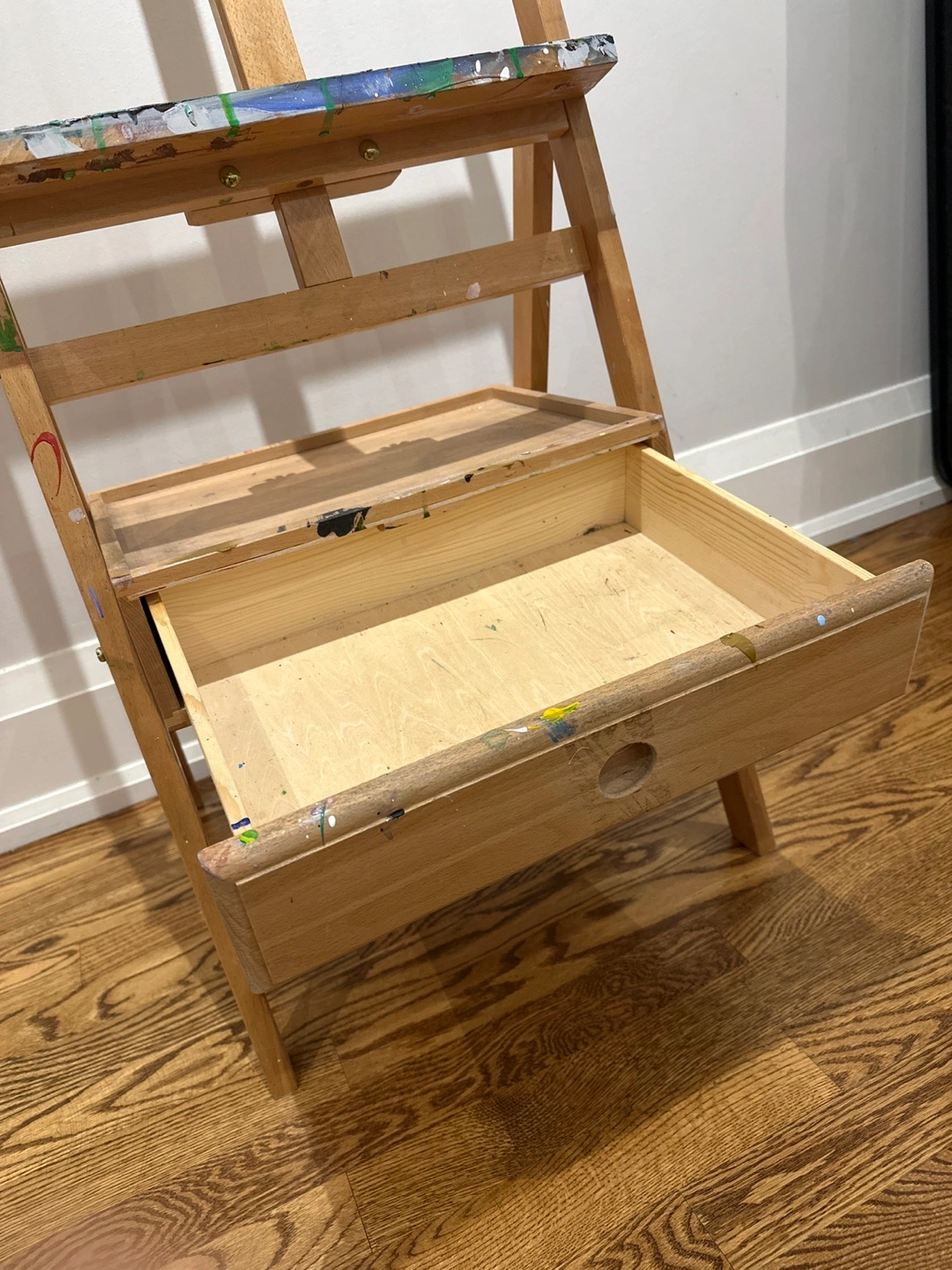 Selling a used wooden artist easel. It has a handy drawer for storing your paints and brushes. There are some paint stains, as you can see in the photos, but it's still sturdy and ready for your next masterpiece!