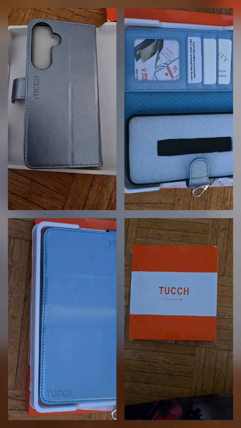 Selling a TUCCH phone case. It's in great condition and comes with the original box. The case features slots for cards and a magnetic closure. It's a stylish and practical way to protect your phone!