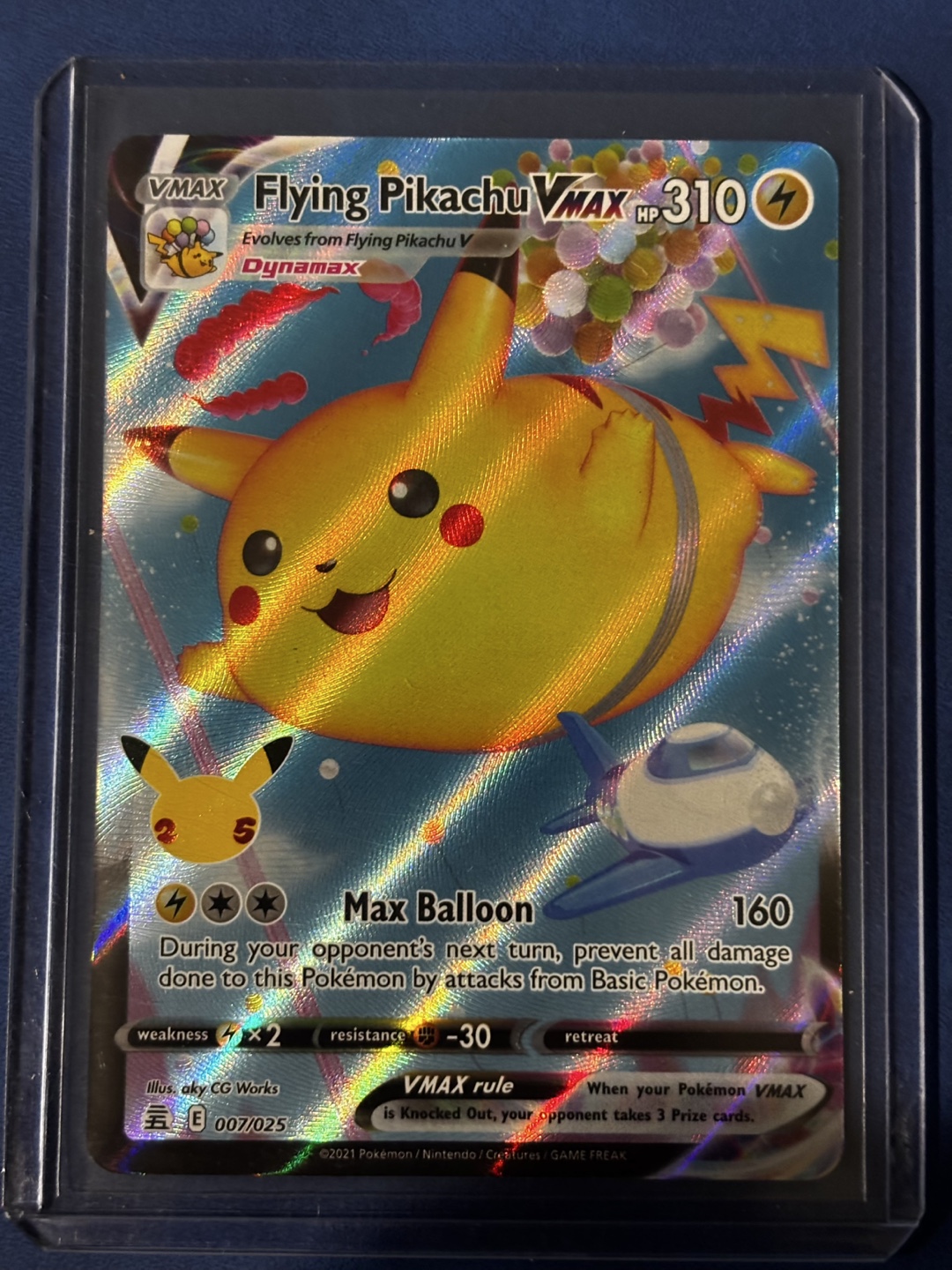 Selling a Flying Pikachu VMAX Pokemon card. It's in great condition and ready for a new home! This card features the Dynamax version of Flying Pikachu V. The card number is 007/025