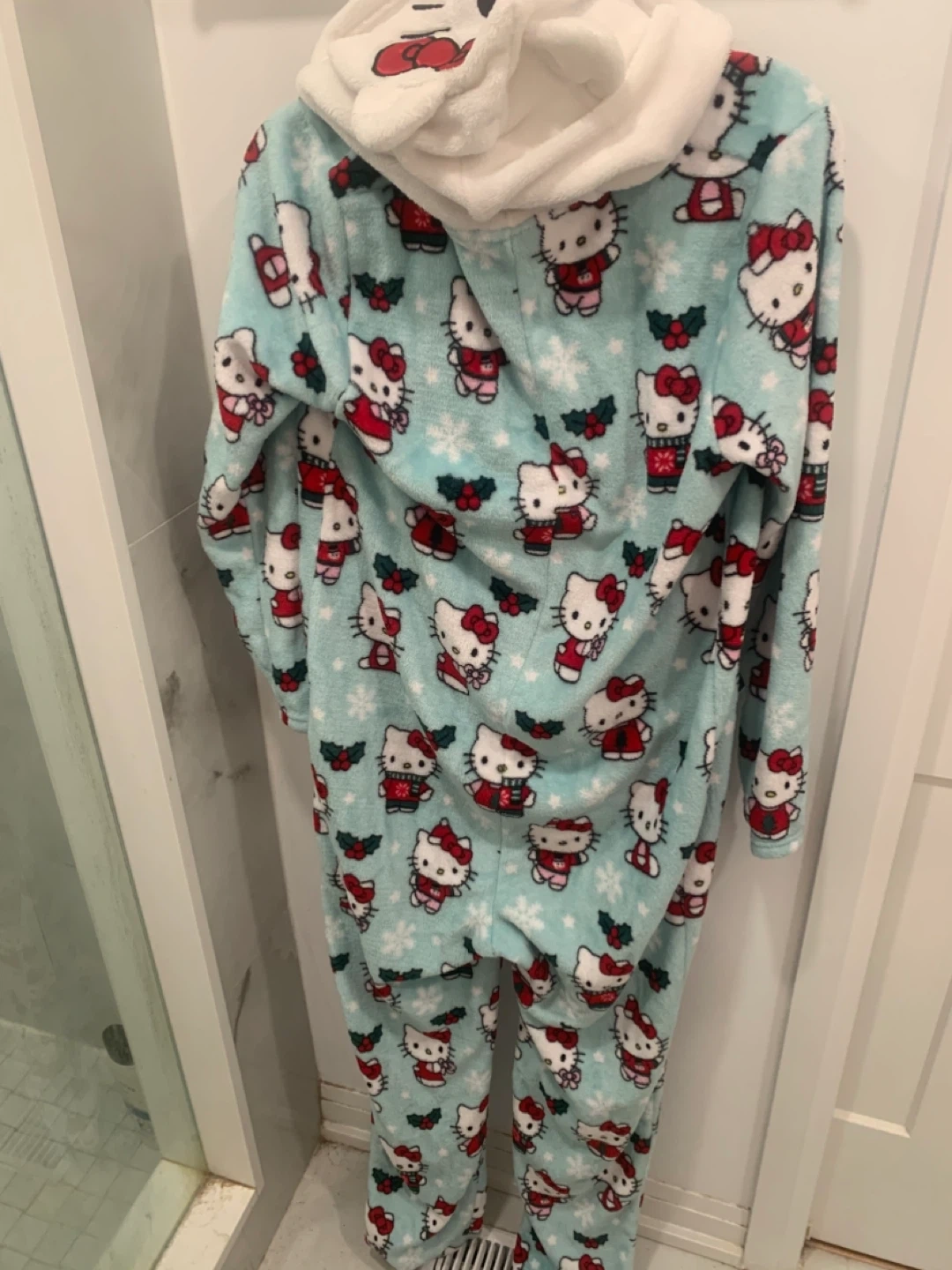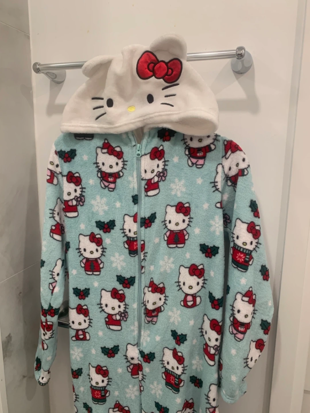 ❤️ PRICE IS FIRM! Super cute Hello Kitty onesie in size M/M! It's a light blue colour with an all-over print of Hello Kitty wearing festive outfits and snowflakes. Made of 100% polyester, so it's nice and cozy for lounging around the house! ❤️
