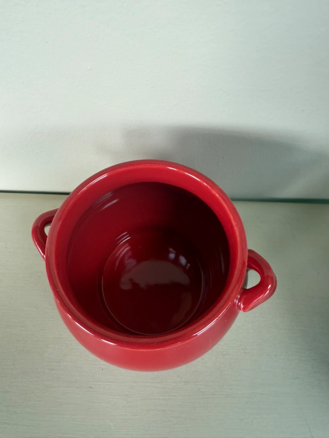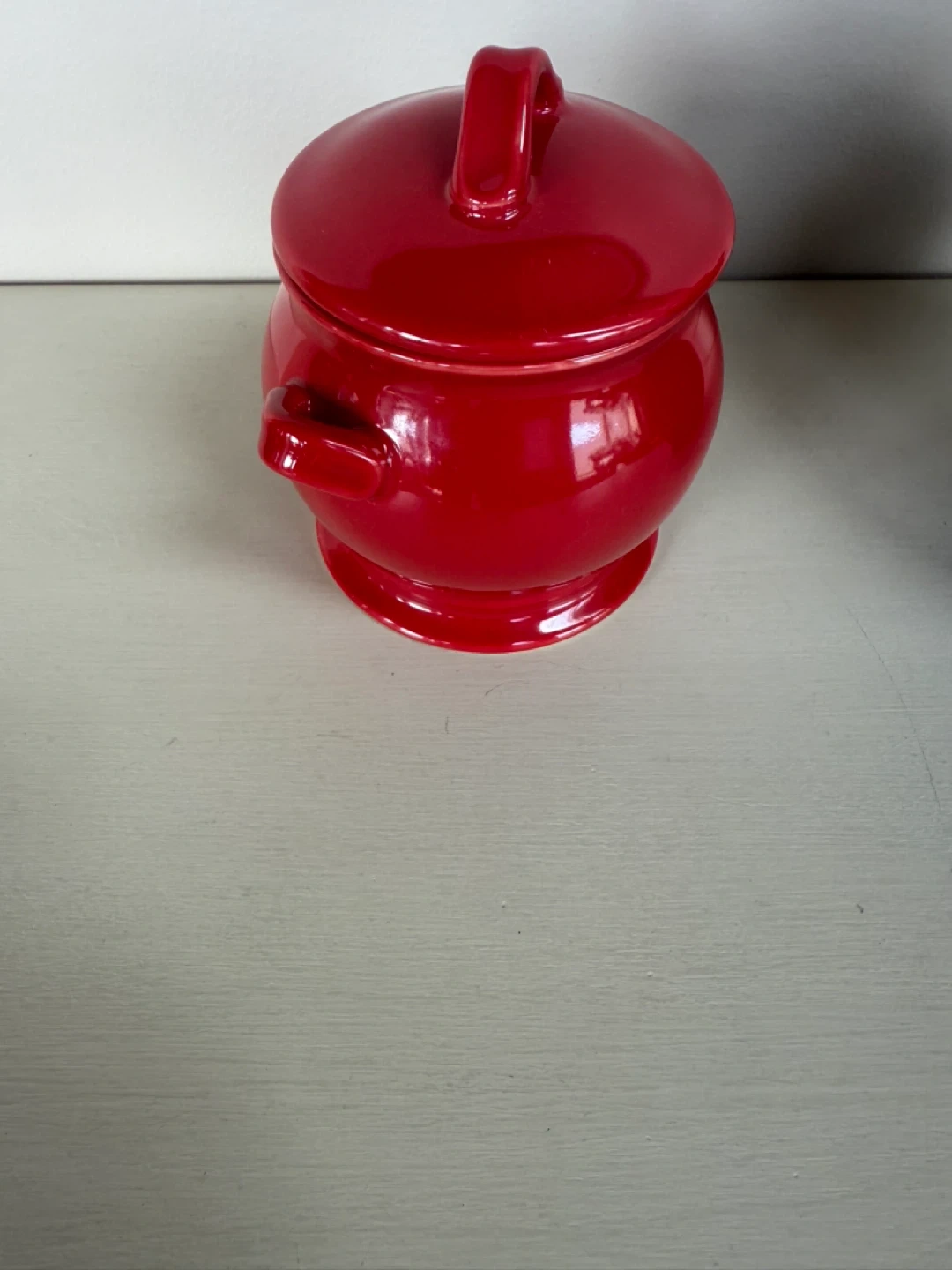 75A cute red ceramic pot with a lid! It's in excellent condition and would look lovely in any kitchen or dining room. Perfect for storing small items or serving condiments. Cash and pick up only in W. Hillhurst NW. Thanks for looking!