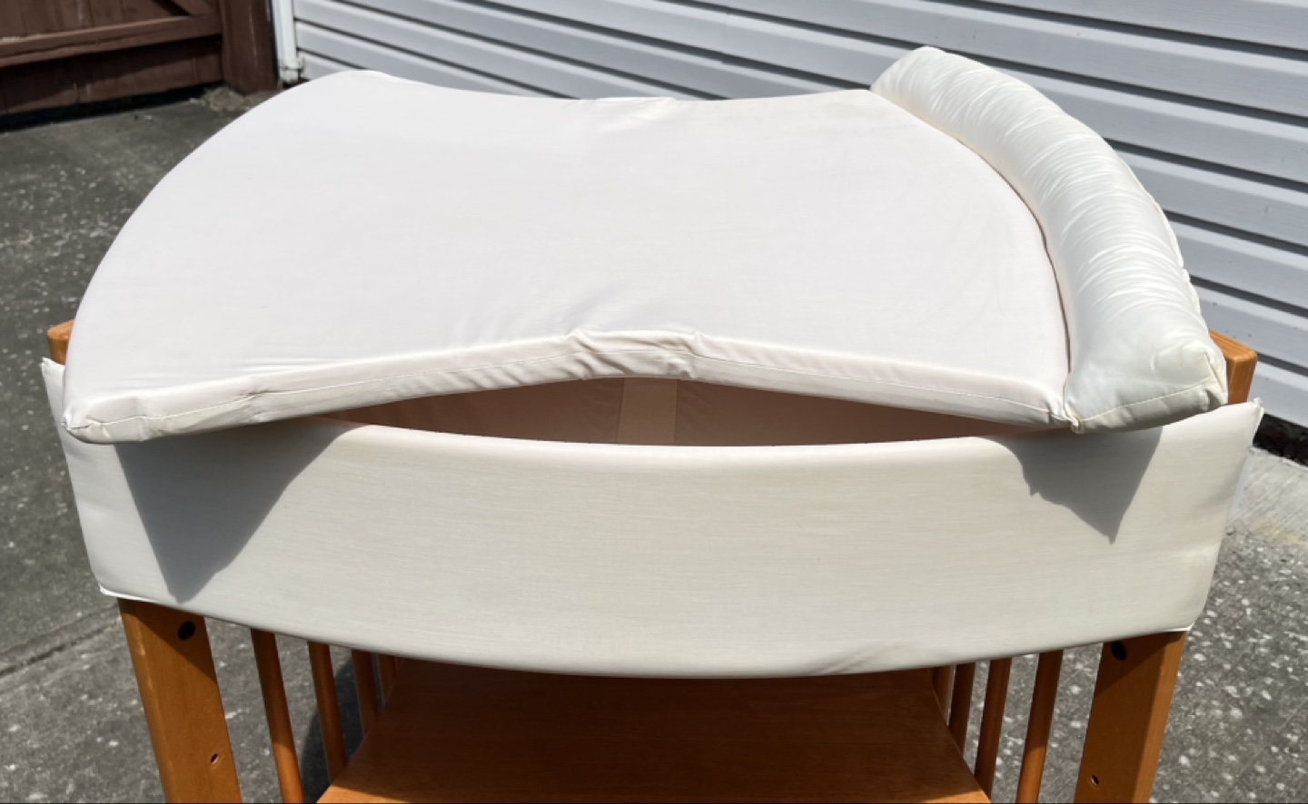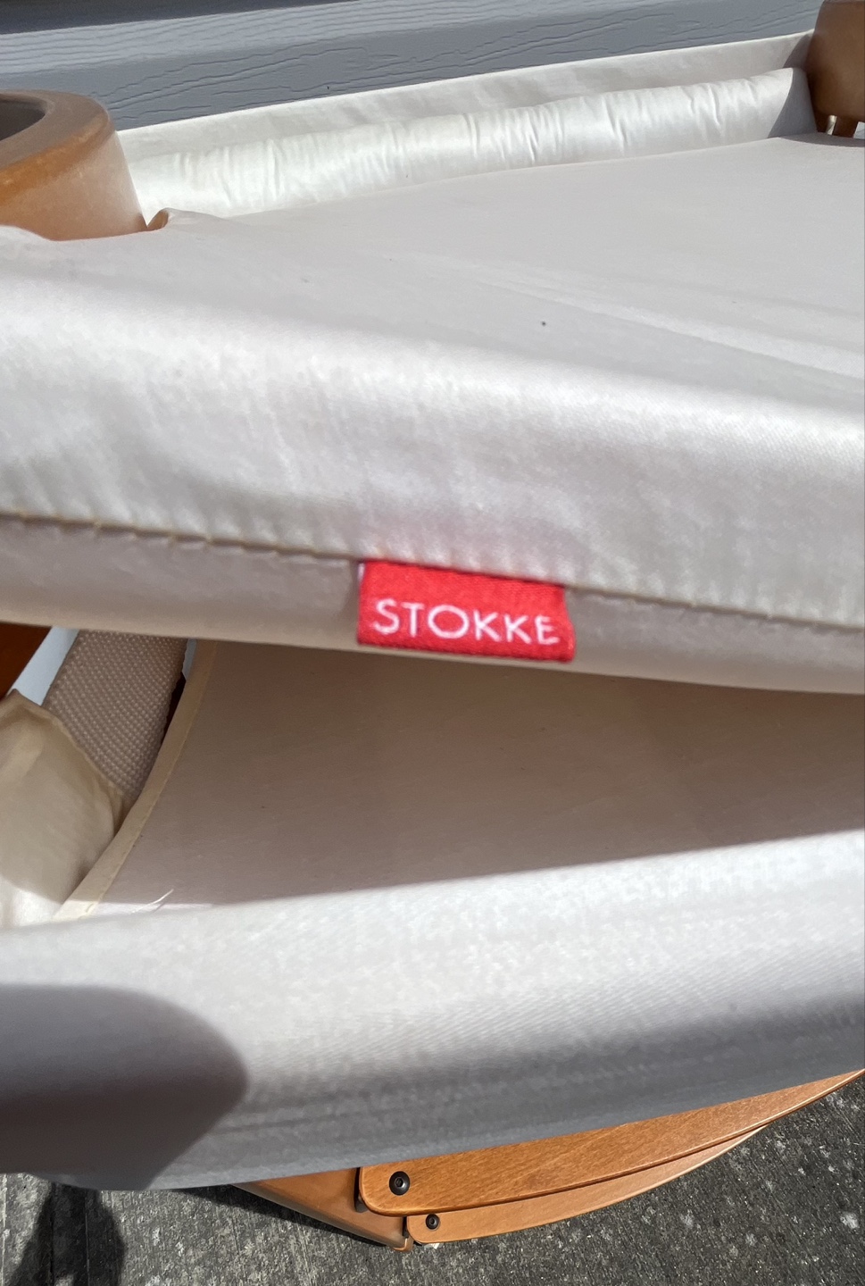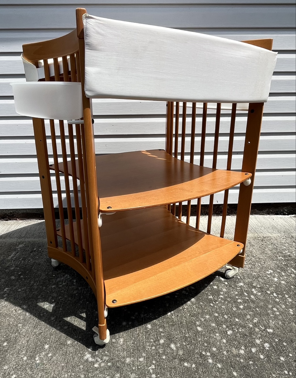 This Stokke is in wonderful condition for its age. It’s been stored indoors in a pet and smoke free home. The beechwood is damage free. There are no rips of any kind on the change pad. Comes with 2 genuine Stokke side baskets.