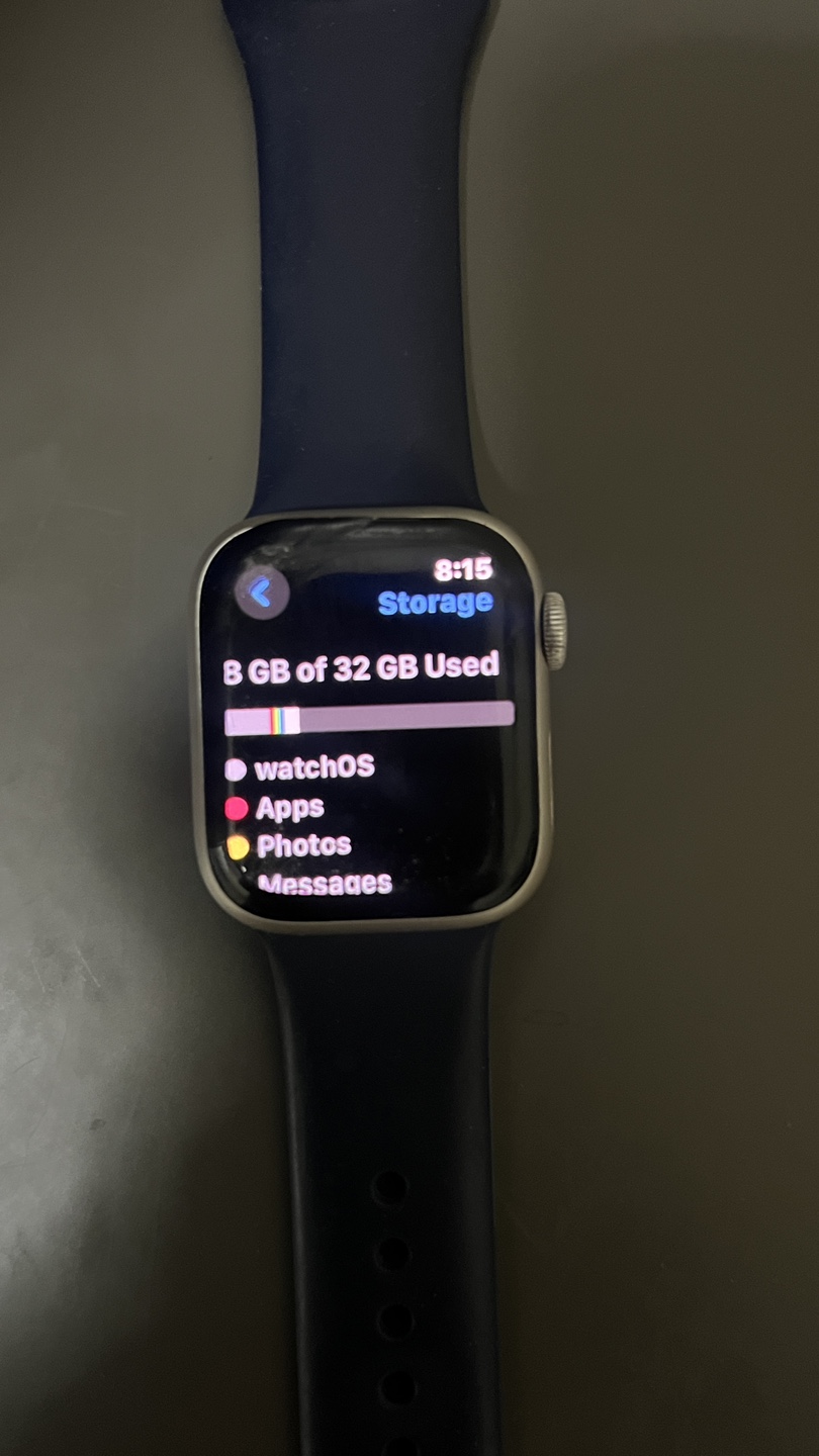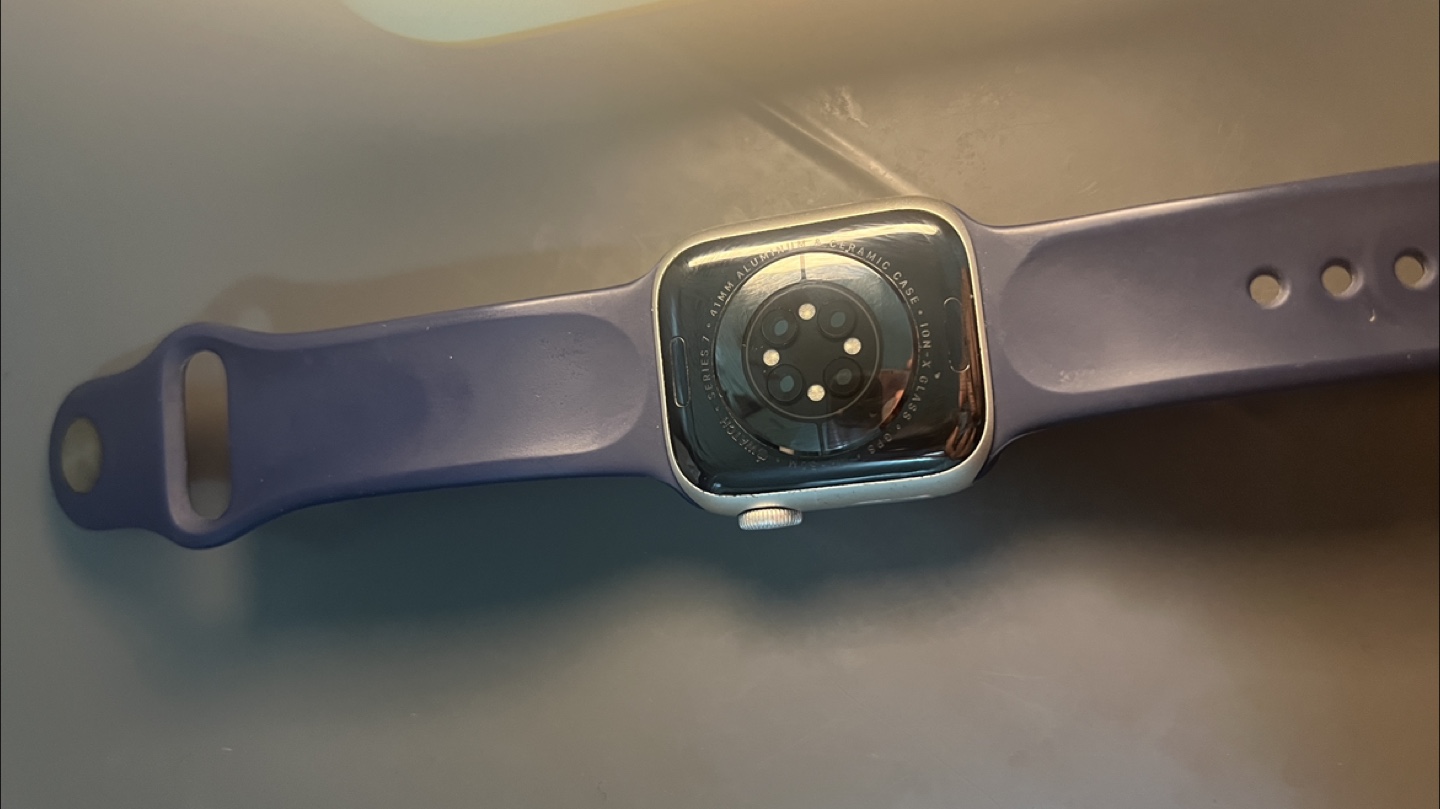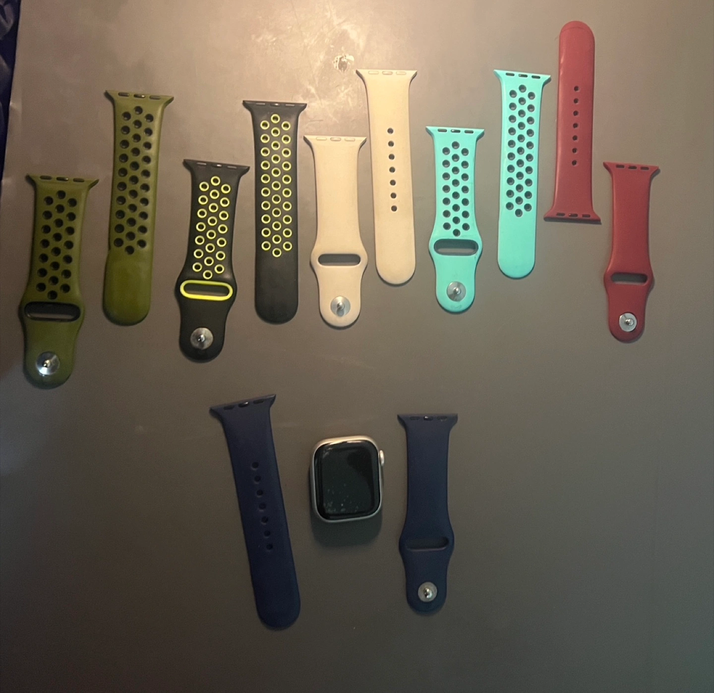 Preowned Apple Watch Series 7 GPS, silver, 32GB storage. Includes 9 apple and nike bands in many colors and styles. 99% battery health.