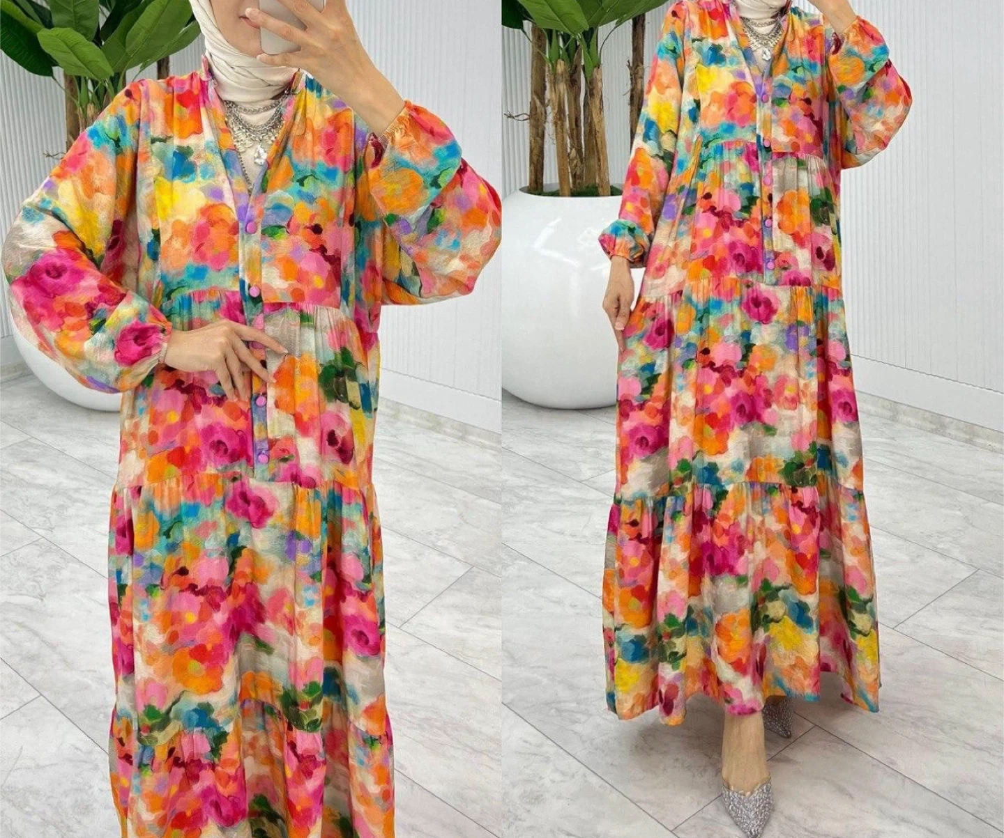 Beautiful floral print maxi dress in vibrant colours! Perfect for a summer day or a special occasion. The dress features a flattering silhouette and comfortable fit. It's in great condition and ready for a new home! Brand new tag still on.