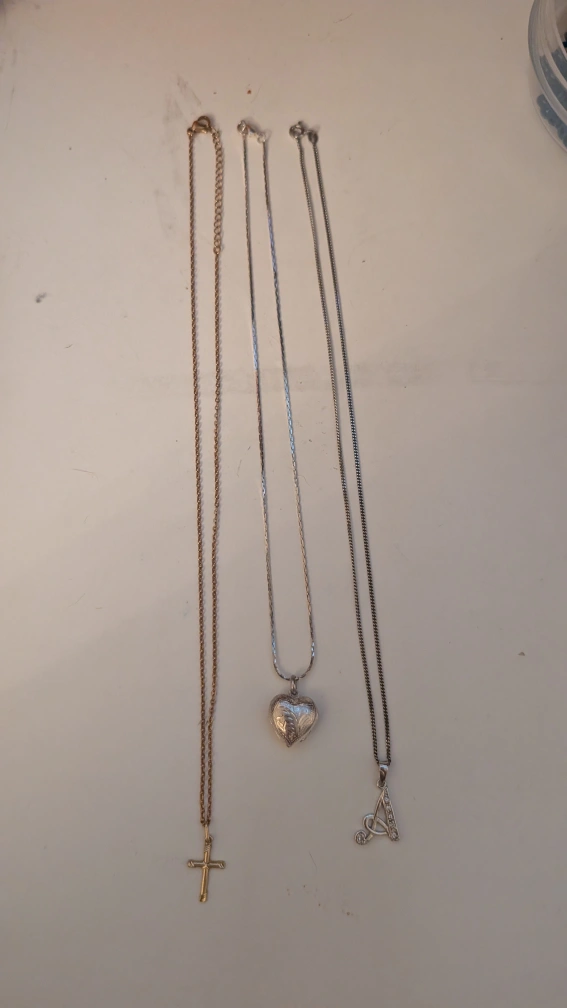 Selling a bundle of three necklaces! Included are a gold-toned cross necklace, a silver-toned heart locket necklace, and a silver-toned initial 'A' pendant necklace