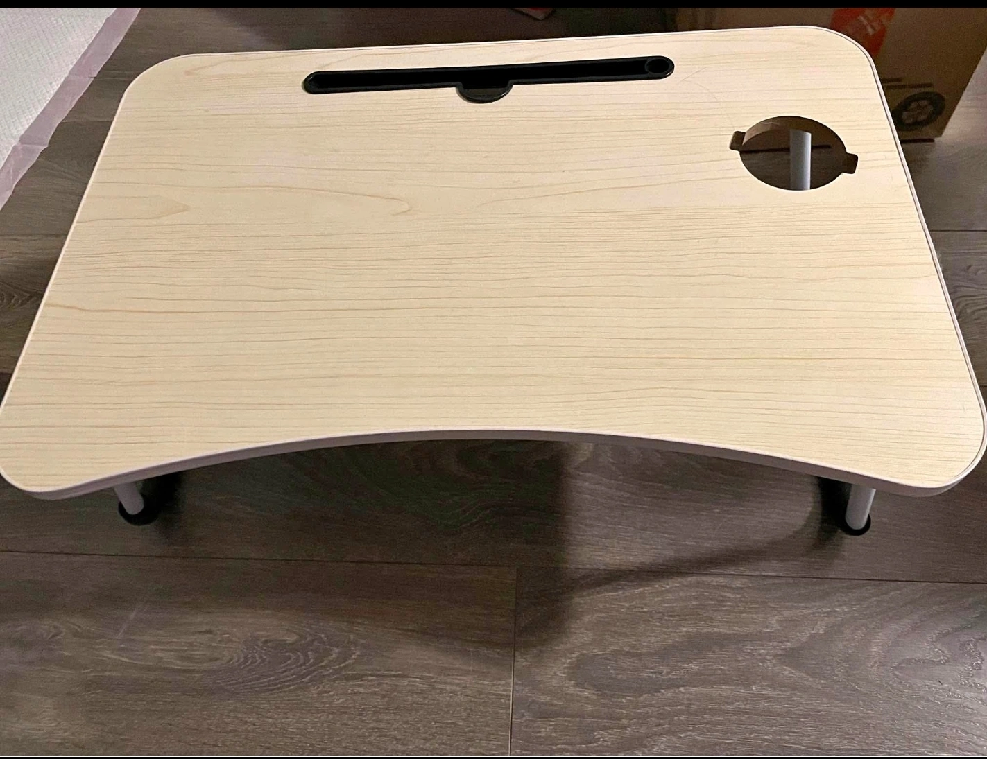 Selling a handy wooden bed desk! It's perfect for working or enjoying breakfast in bed. It features a convenient cup holder and a slot for your tablet or phone. Great for students or anyone who likes to relax comfortably!