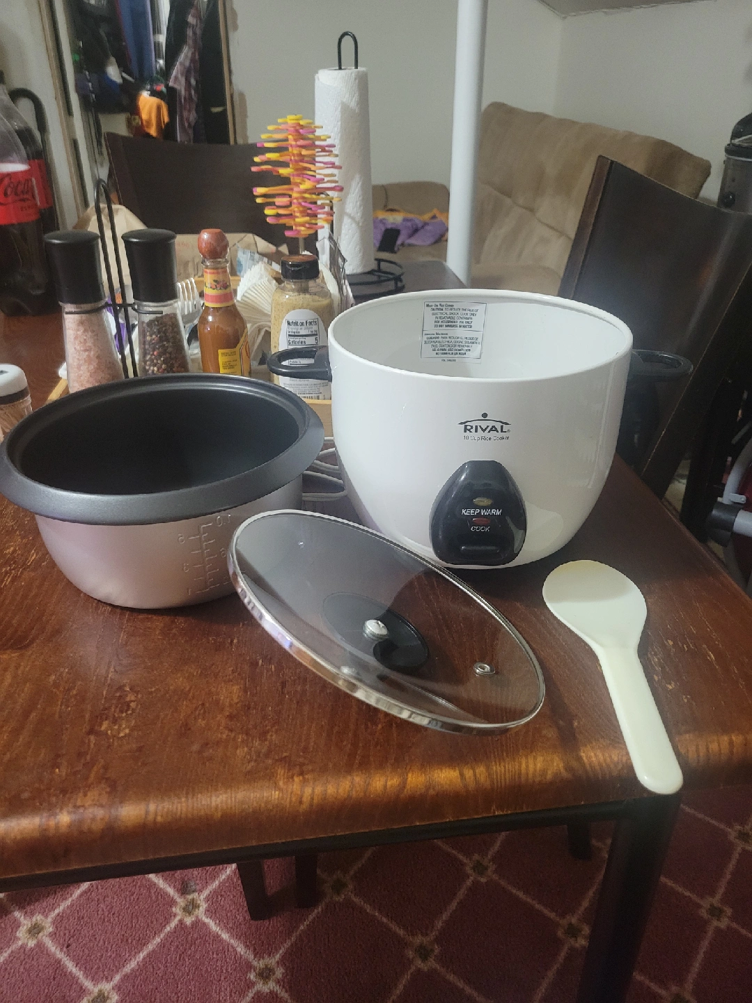 I'm selling a Rival 10-cup rice cooker. It's in great condition and ready to help you make delicious rice! It has settings for both cooking and keeping warm, so your rice is always ready when you are. Was given this. Was awesome Rice cooker but haven't used it in a while. Comes with rice spoon.