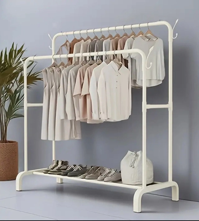 Brand new. Price firm. This sturdy double-rail clothing rack is perfect for adding extra hanging space. It's great for organizing clothes in a spare room, laundry room, or even a retail setting. The rack features two rails for hanging clothes and a bottom shelf for shoes or storage bins. Additional Specifications: * Double-rail design for maximum hanging space * Bottom shelf for shoes or storage * Sturdy metal construction * Easy to assemble * Dimensions: As shown in the pictures. If you see this ad, it's still available!