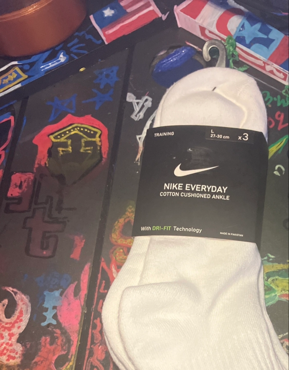 18Selling a new pack of Nike Everyday cotton cushioned ankle socks. These are size L (27-30cm) and come with 3 pairs in the pack. They feature Dri-FIT technology for comfort during training or everyday wear
