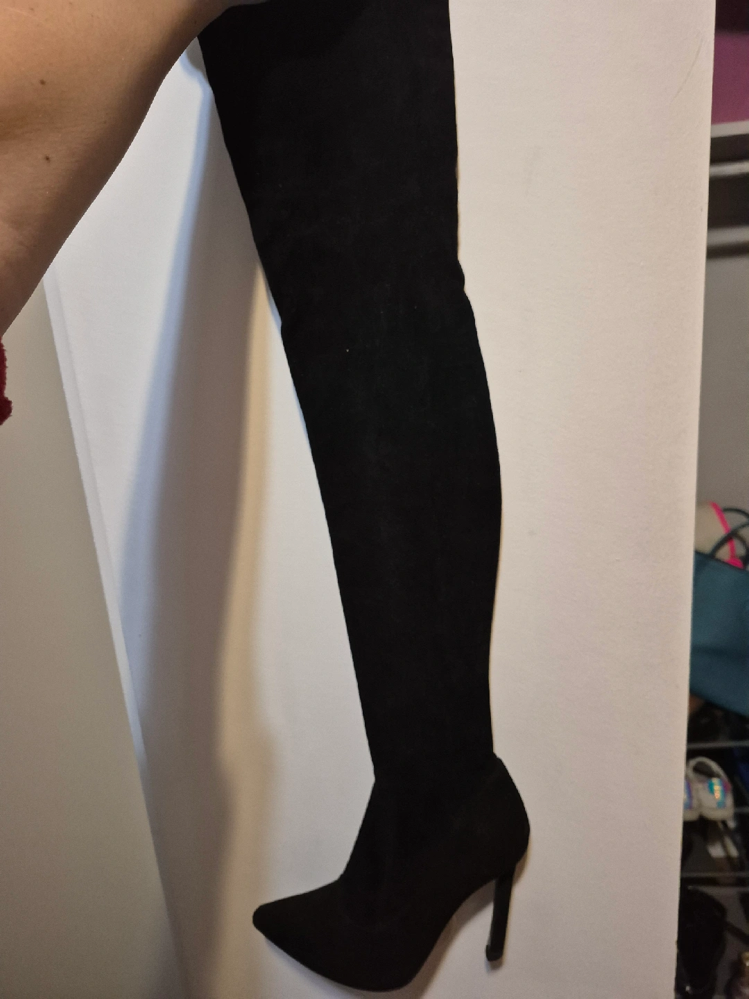 Selling a pair of black thigh-high heel boots. They are in good condition and would be a great addition to your wardrobe!