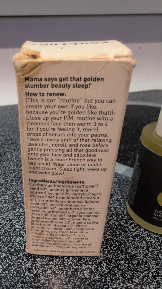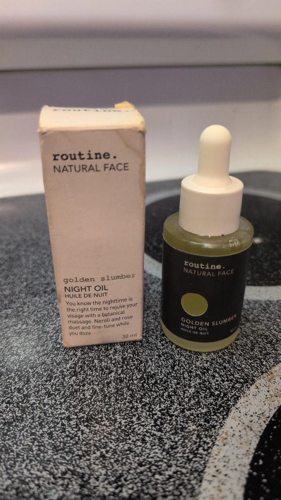 Selling a Routine. Natural Face Golden Slumber Night Oil! It's a 30 ml bottle of night oil designed to rejuvenate your visage with a botanical blend. The box includes information on how to renew your skin using this 'routine' with relaxing lavender, neroli, and rose.