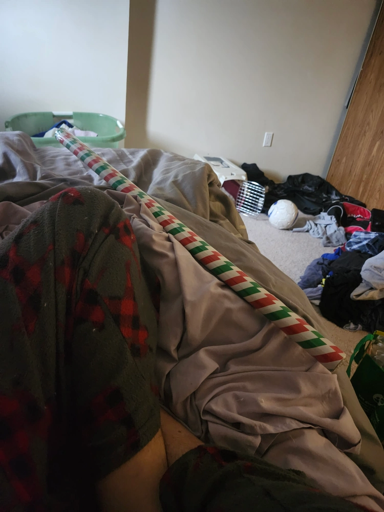 Selling a roll of wrapping paper with a festive red, green, and white striped pattern! Perfect for the holiday season