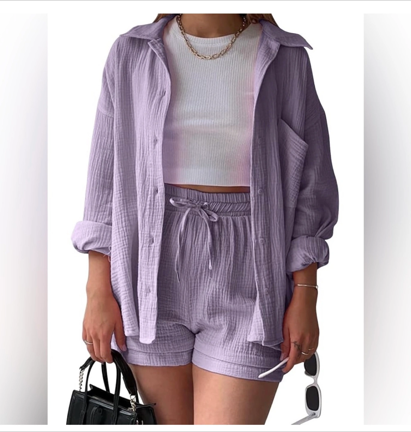 260Fabric comes with pleated texture and it is light, soft, sweat-absorbing and breathable. Loose shirt top: Cotton linen shirts, pleated process, long sleeve, button down closure, lapel collar, oversized shirts with one chest pocket, solid color, loose fitting style. High waist shorts: Adjustable waist rope that you can adjust to your comfort with the drawstring. Elastic waistband, not to strangle the stomach. Wide leg design. Matching: Women's matching sets summer, linen sets for women, perfect match with heels, sneakers, necklaces and hats to complete a casual look. It could also be wear separately. Button down shirts can be wear as a beach shirt or pair with jeans and trouser. High waist shorts can be matched with cami top, bra, tunic and T-shirt for a chic look.