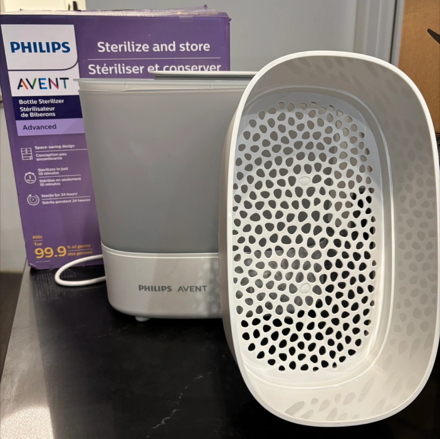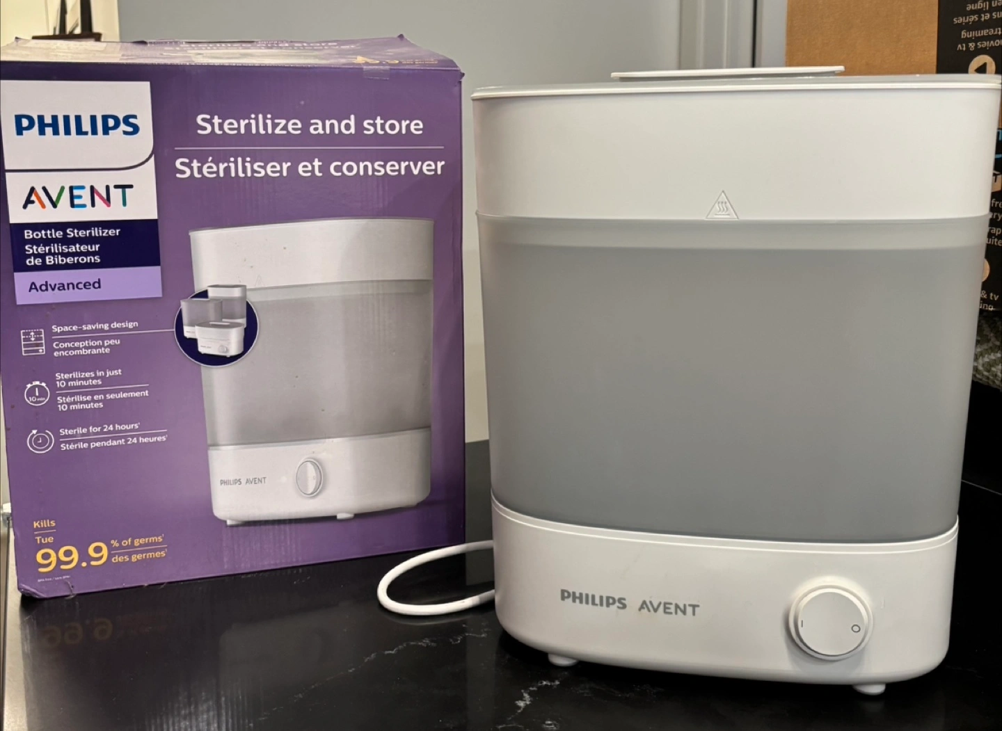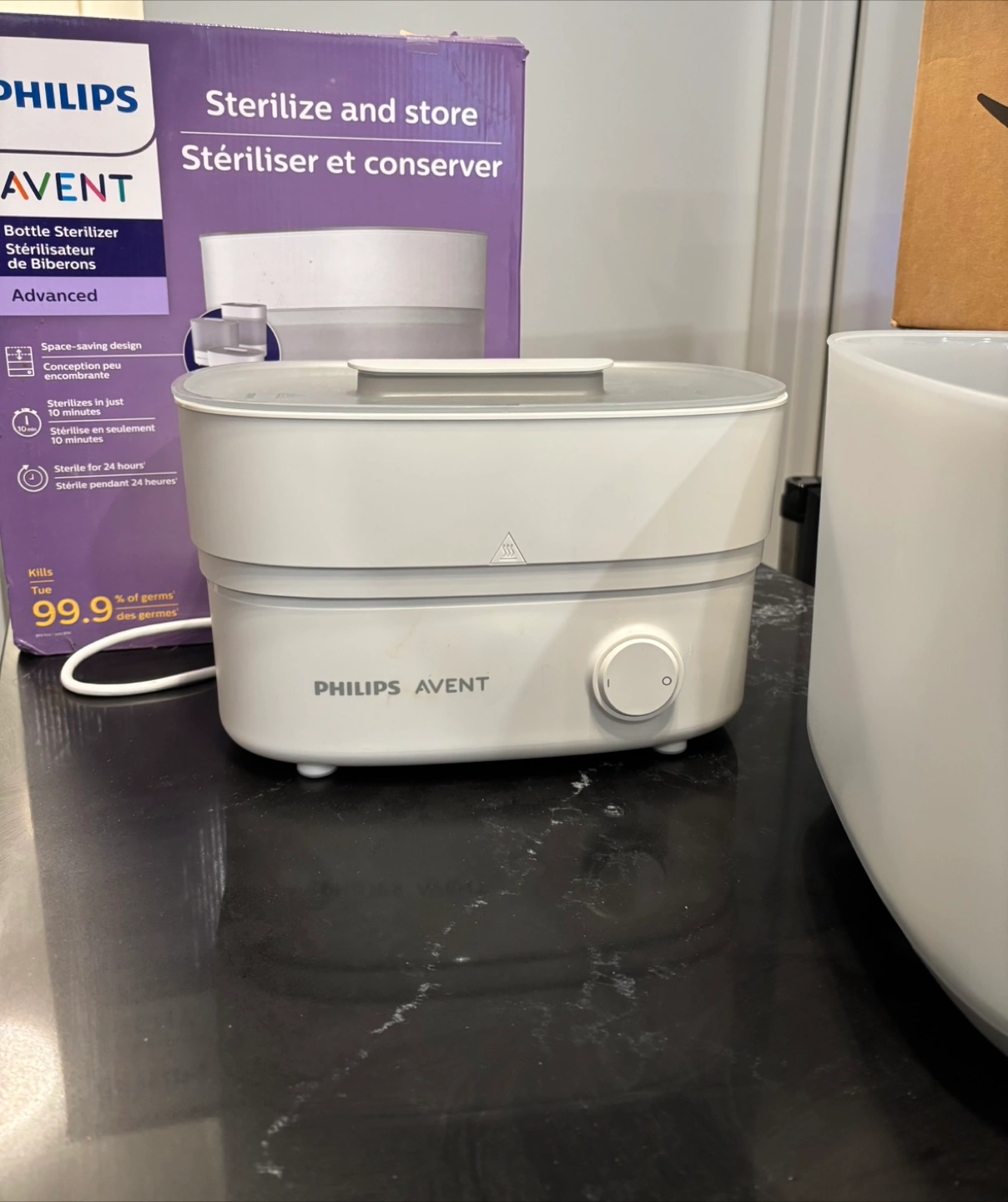 Selling a Philips Avent bottle sterilizer in excellent condition! It's designed to sterilize and store baby bottles and accessories. It's a space-saving design that sterilizes in just 10 minutes and keeps items sterile for 24 hours. It kills 99.9% of germs. Comes with the original box!