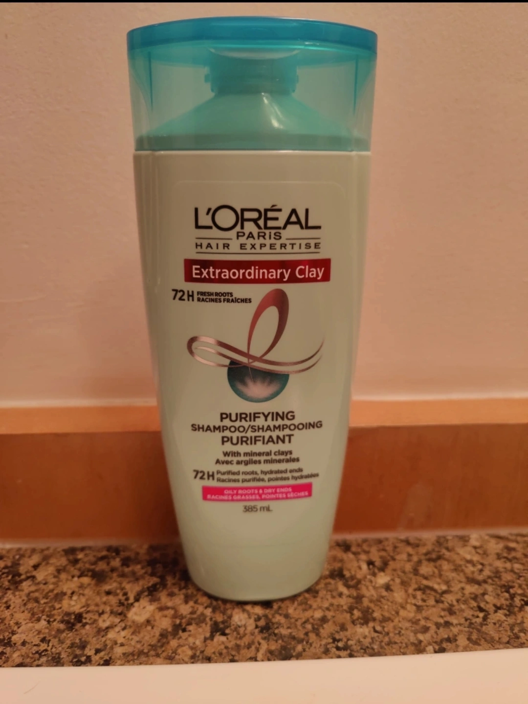 I'm selling a bottle of L'Oréal Paris Hair Expertise Extraordinary Clay Purifying Shampoo. It's designed for oily roots and dry ends, and contains mineral clays. The bottle contains 385 mL of shampoo and promises 72 hours of fresh roots.