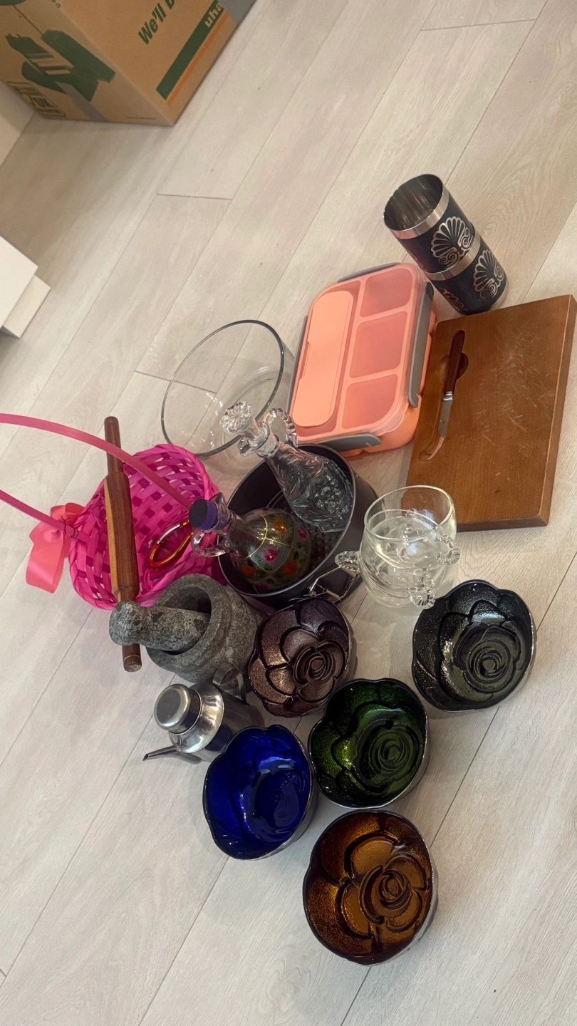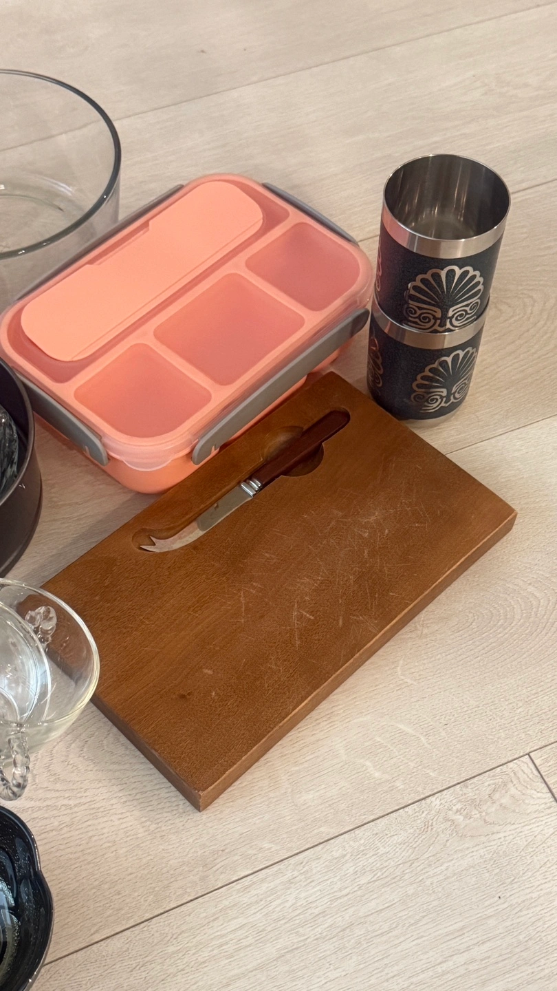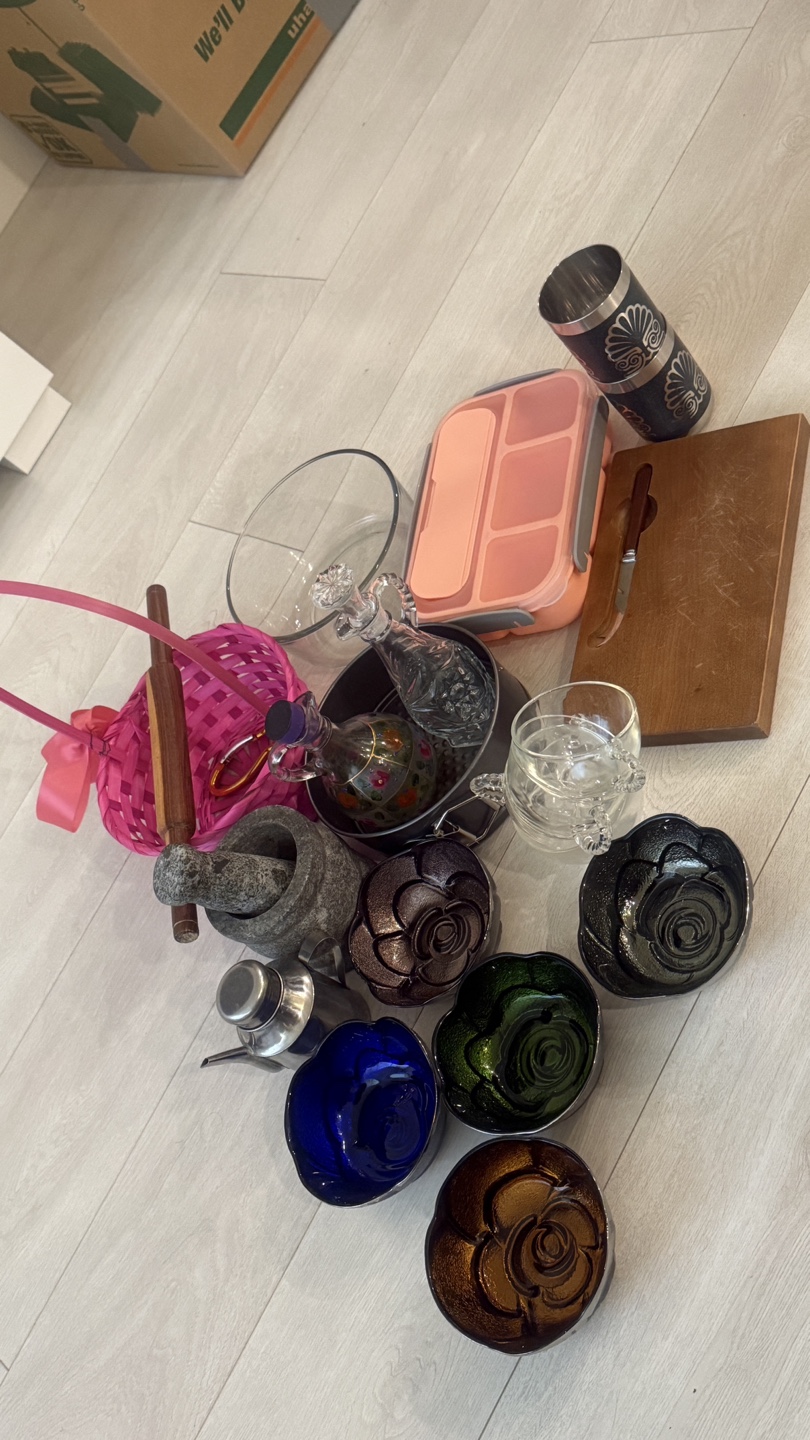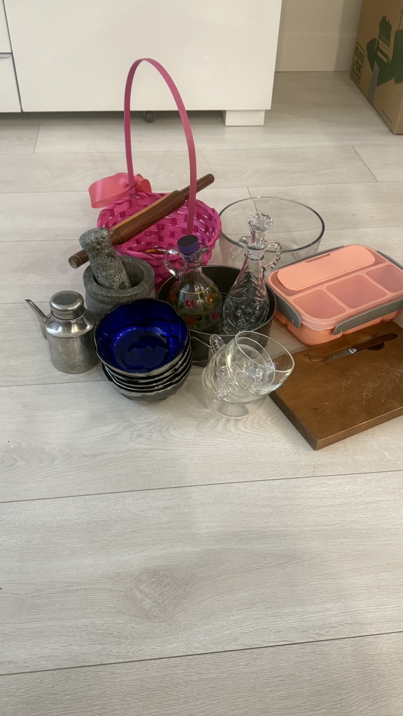 Giving away a collection of kitchen items including a pink lunchbox, wooden cutting board, glass bowls, decorative bowls, and other kitchen accessories. Great for stocking up your kitchen or adding to your collection!