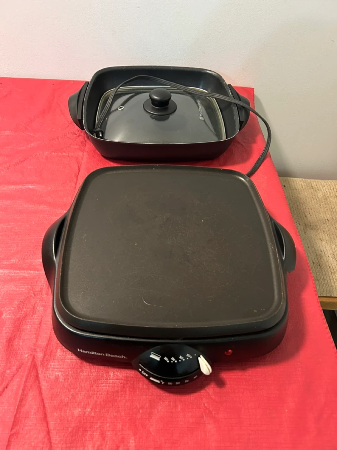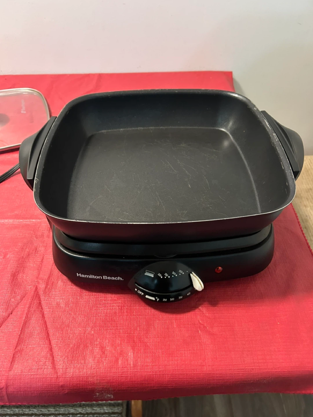 Selling a Hamilton Beach nonstick skillet griddle, model 38500. It comes with a lid and temperature control dial. Perfect for cooking a variety of meals!