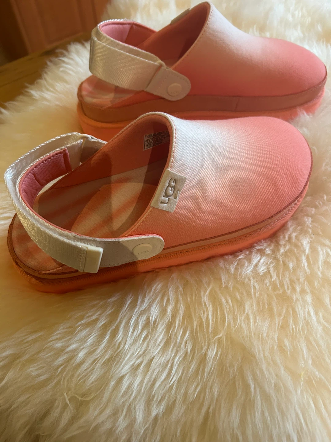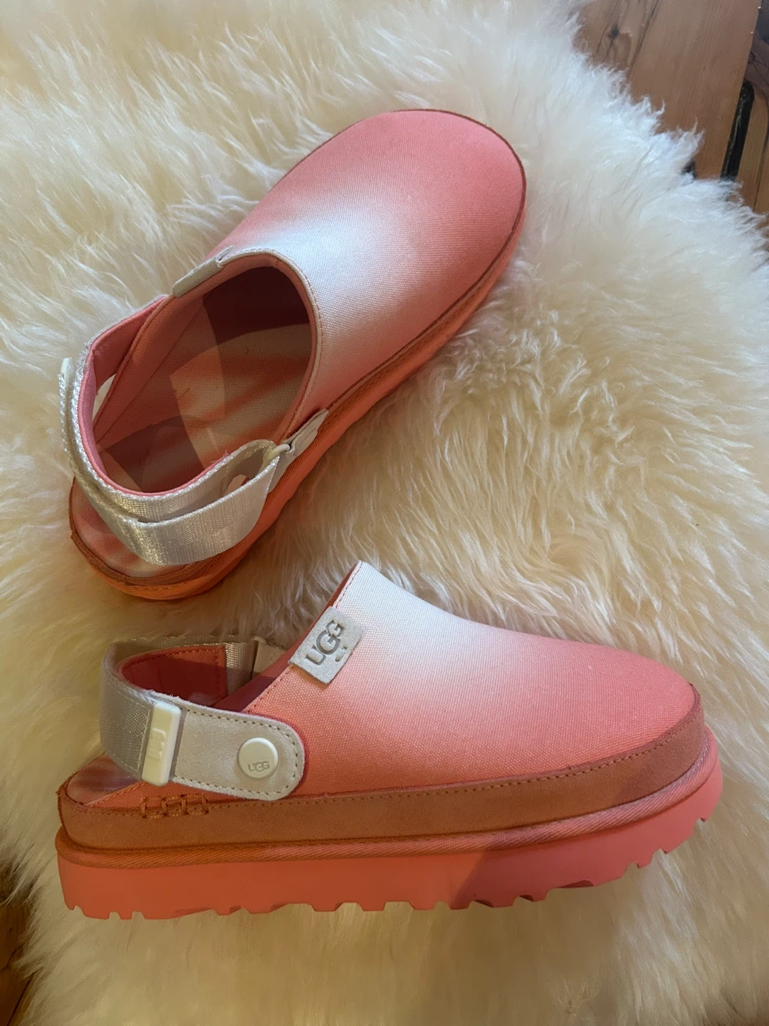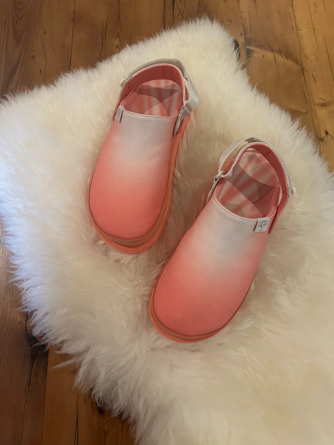Enhanced with a glowing, ombré finish. The adjustable back strap features a swivel design for a 2-in-1 wearing option—wear it as a heel strap or flip it to the front for an easy on/off, open-back option. The ultra-lightweight outsole is made from sugarcane EVA that provides all-day cushioning and springy support.