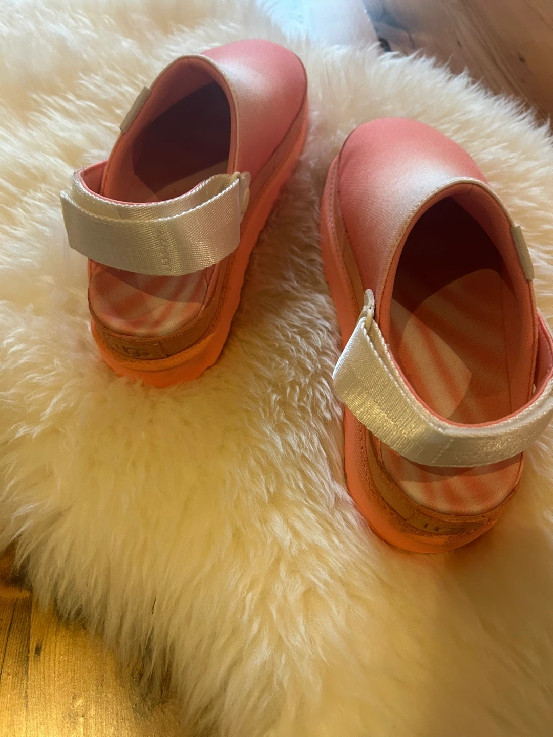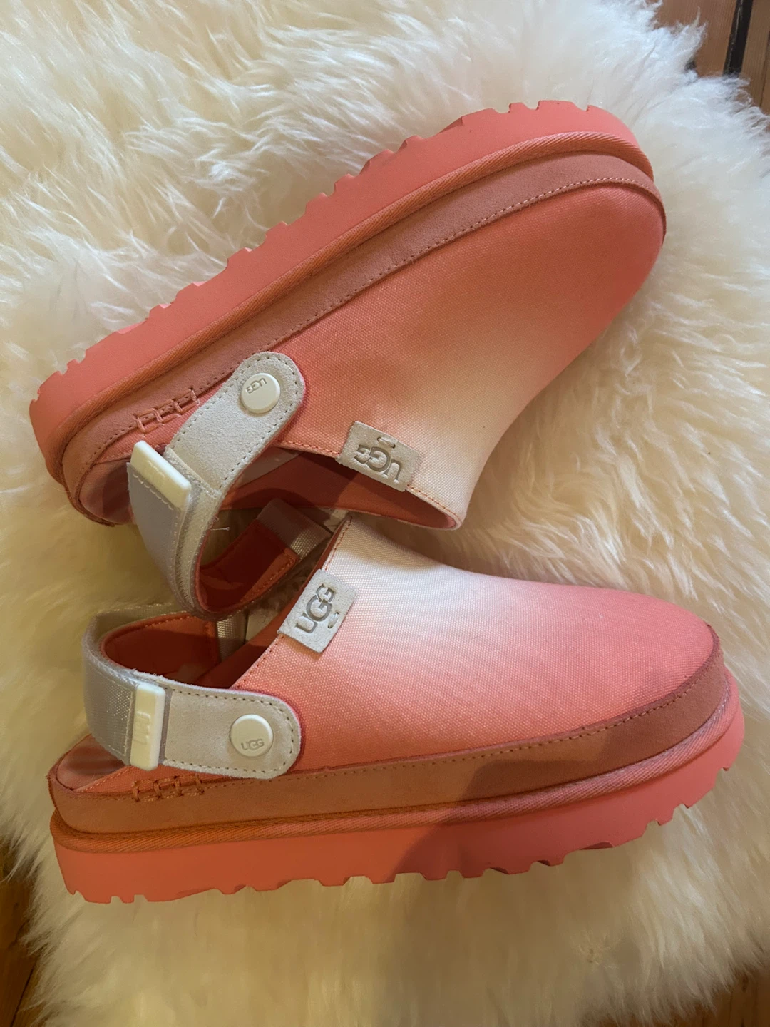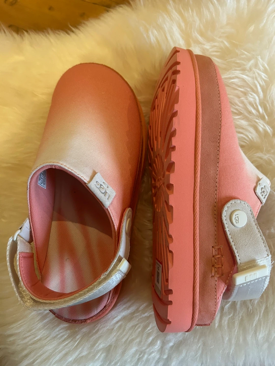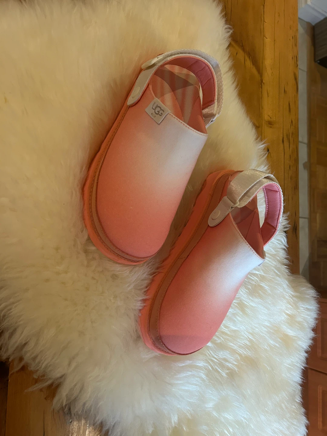 Enhanced with a glowing, ombré finish. The adjustable back strap features a swivel design for a 2-in-1 wearing option—wear it as a heel strap or flip it to the front for an easy on/off, open-back option. The ultra-lightweight outsole is made from sugarcane EVA that provides all-day cushioning and springy support.