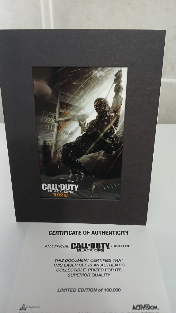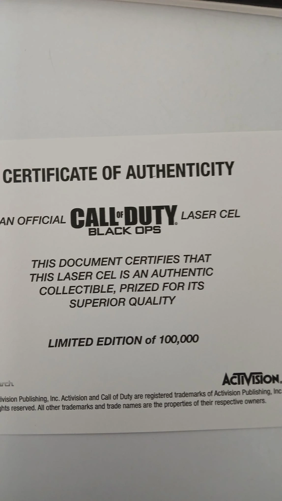 Call of Duty laser cell card with certificate of authenticity for $10.00 . in excellent condition. porch pickup at Dufferin and Bloor st.
