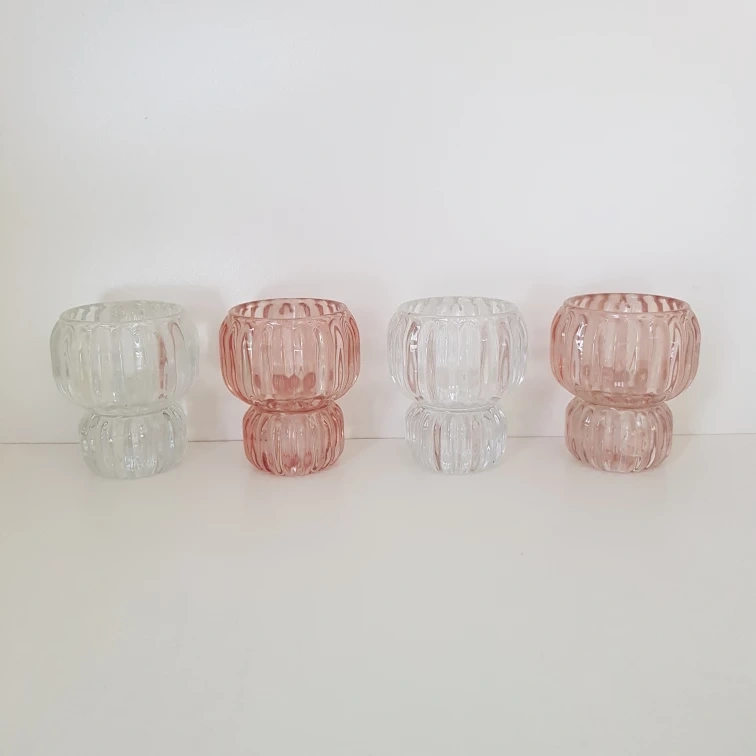 Selling a set of four glass tea light candle holders. They're in great condition and ready to add a cozy touch to your home. Two are clear glass and two have a slight pink tint. Perfect for creating a relaxing atmosphere! My brother used them for his date night and no longer wants them.