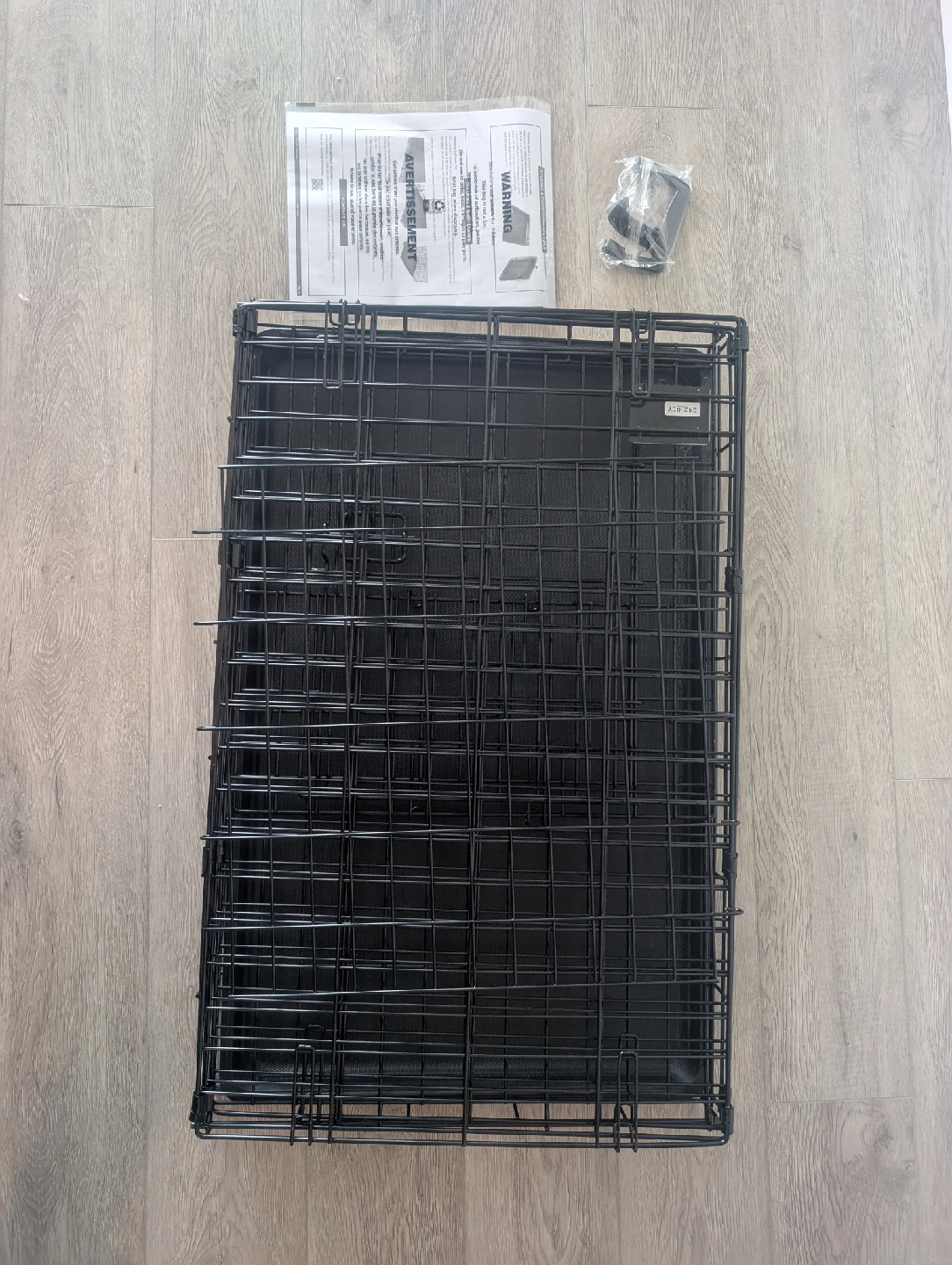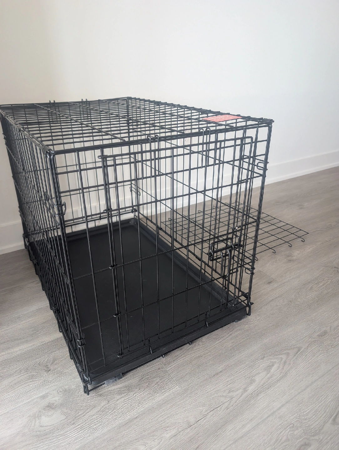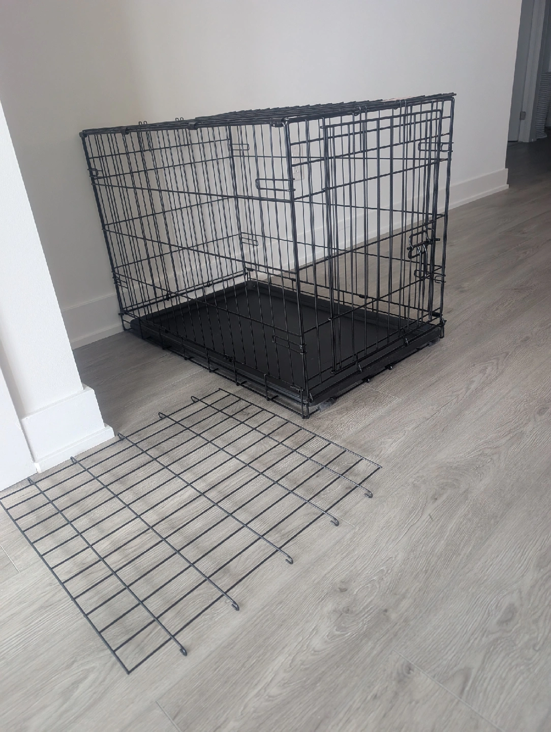 Selling a dog crate in great condition! It's black and measures approximately 30 inches long, 19 inches wide, and 21 inches high. Comes with the bottom tray and a divider panel, plus some instructions and hardware.