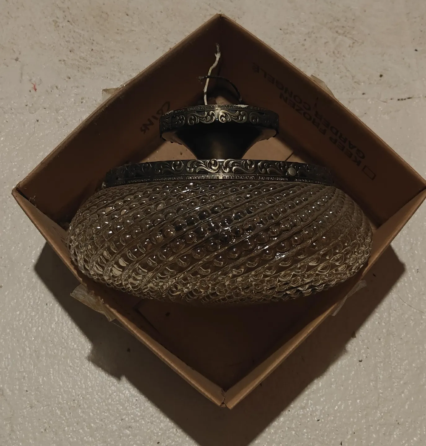 Selling a vintage glass ceiling light fixture. It comes in its original box. The fixture has a lovely textured glass design and ornate metal detailing. It would add a touch of vintage charm to any room!