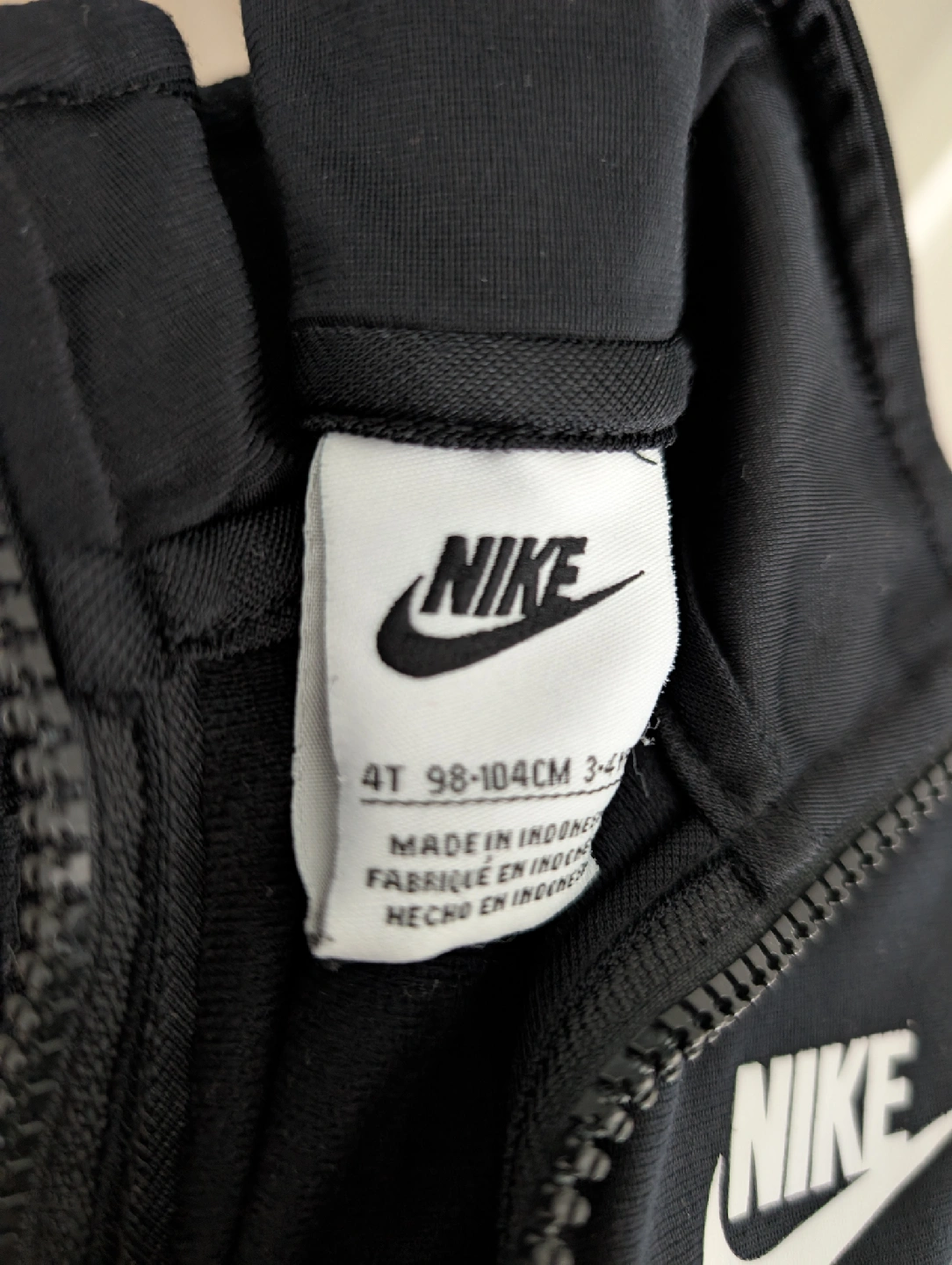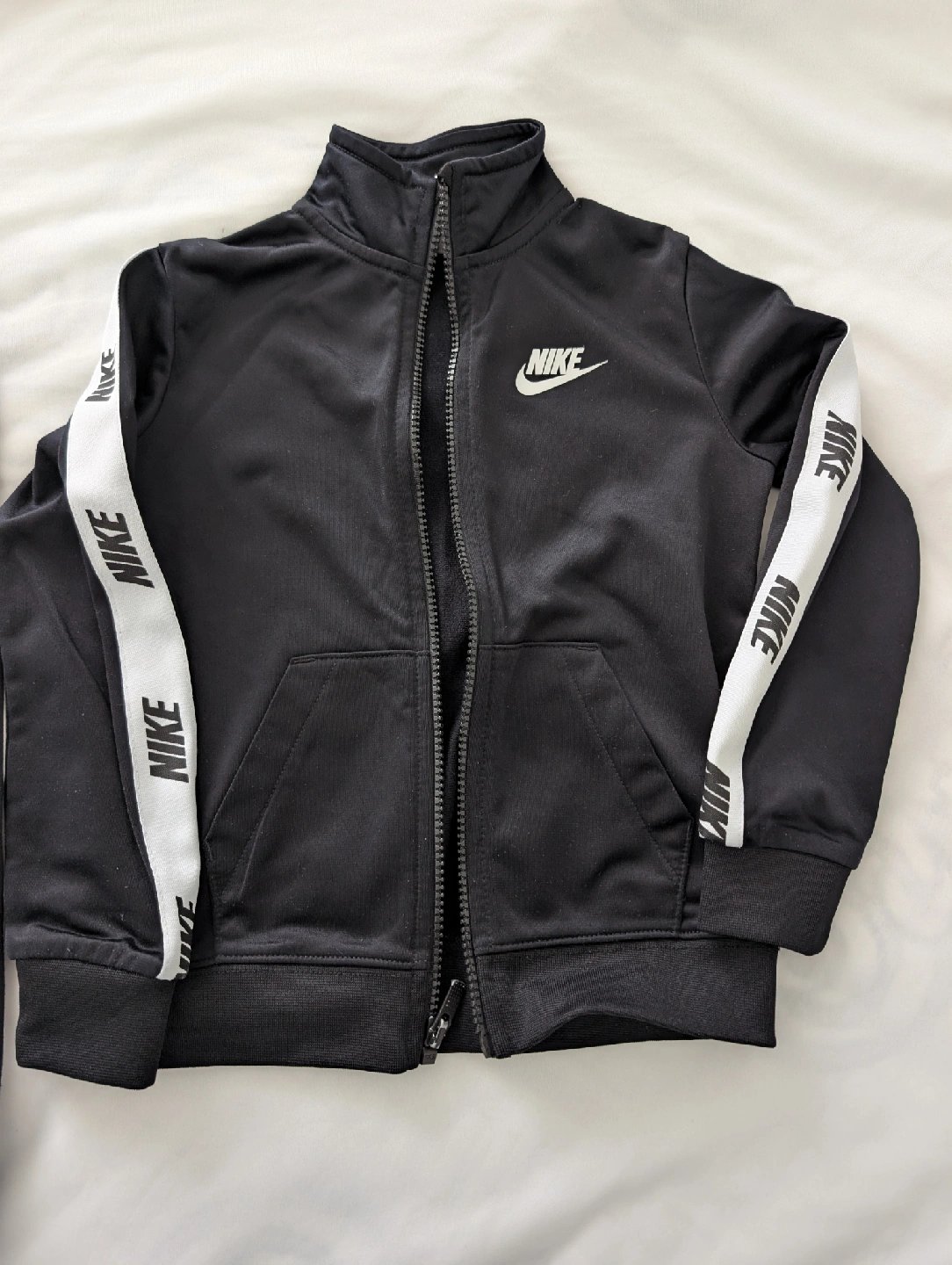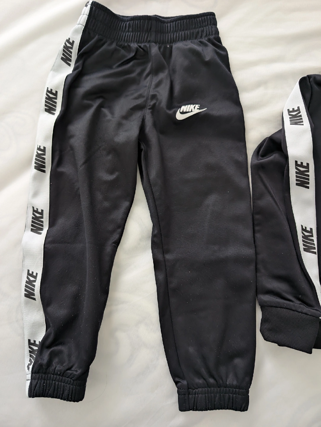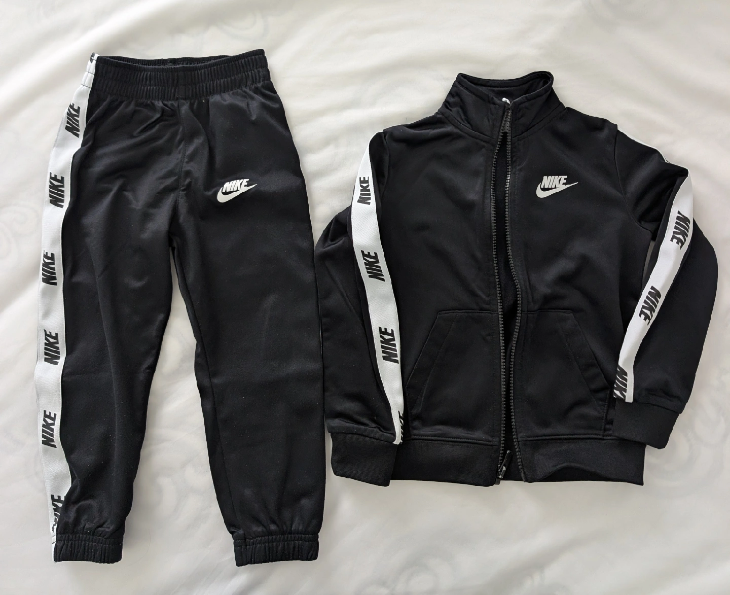 Black Nike tracksuit set with black and white logo stripes down the sleeves and pants, size 4T! In great condition.