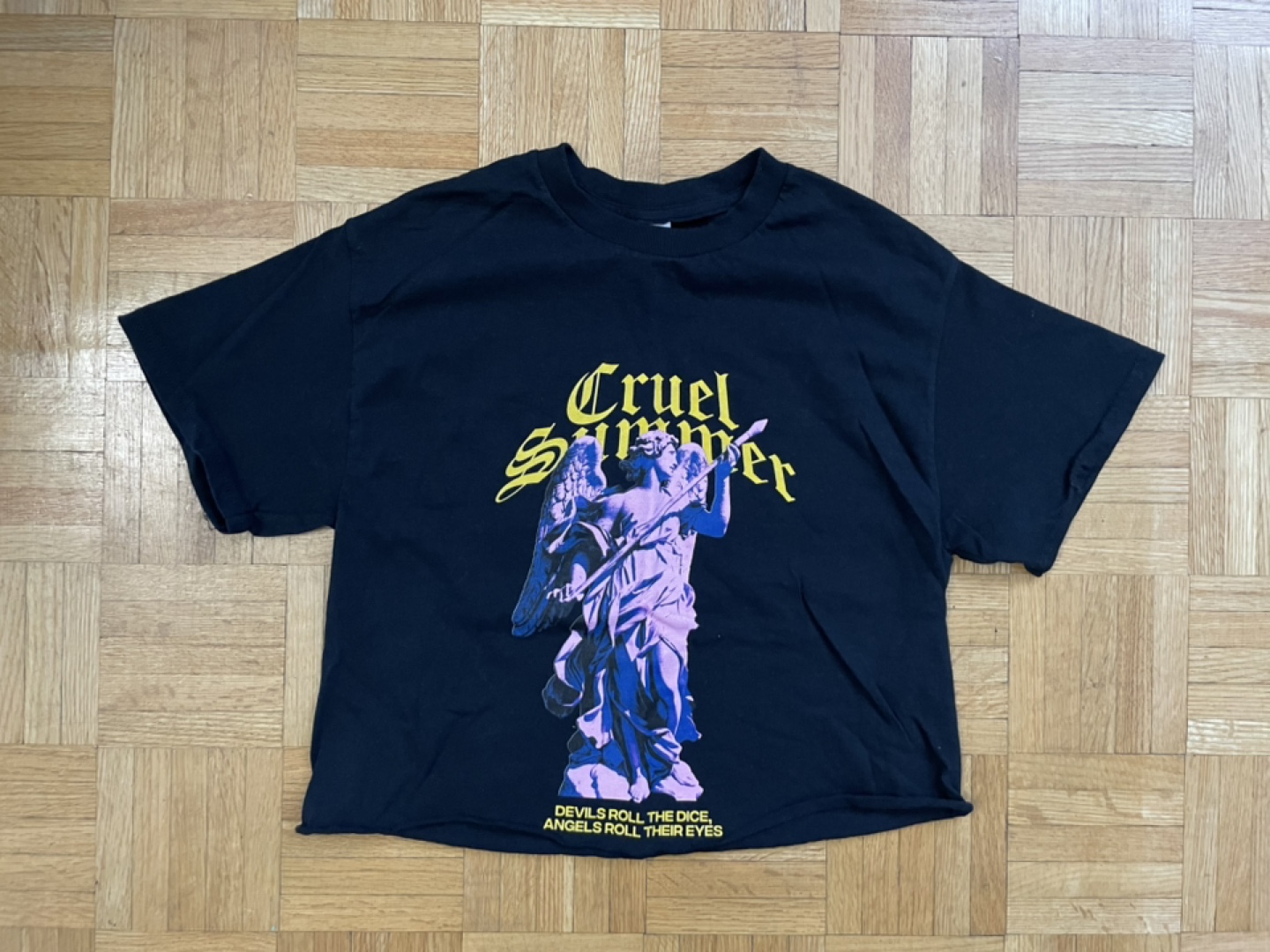 Selling a black graphic tee with a 'Cruel Summer' design featuring an angel. The shirt also has the text 'DEVILS ROLL THE DICE, ANGELS ROLL THEIR EYES' at the bottom. Perfect for casual wear!