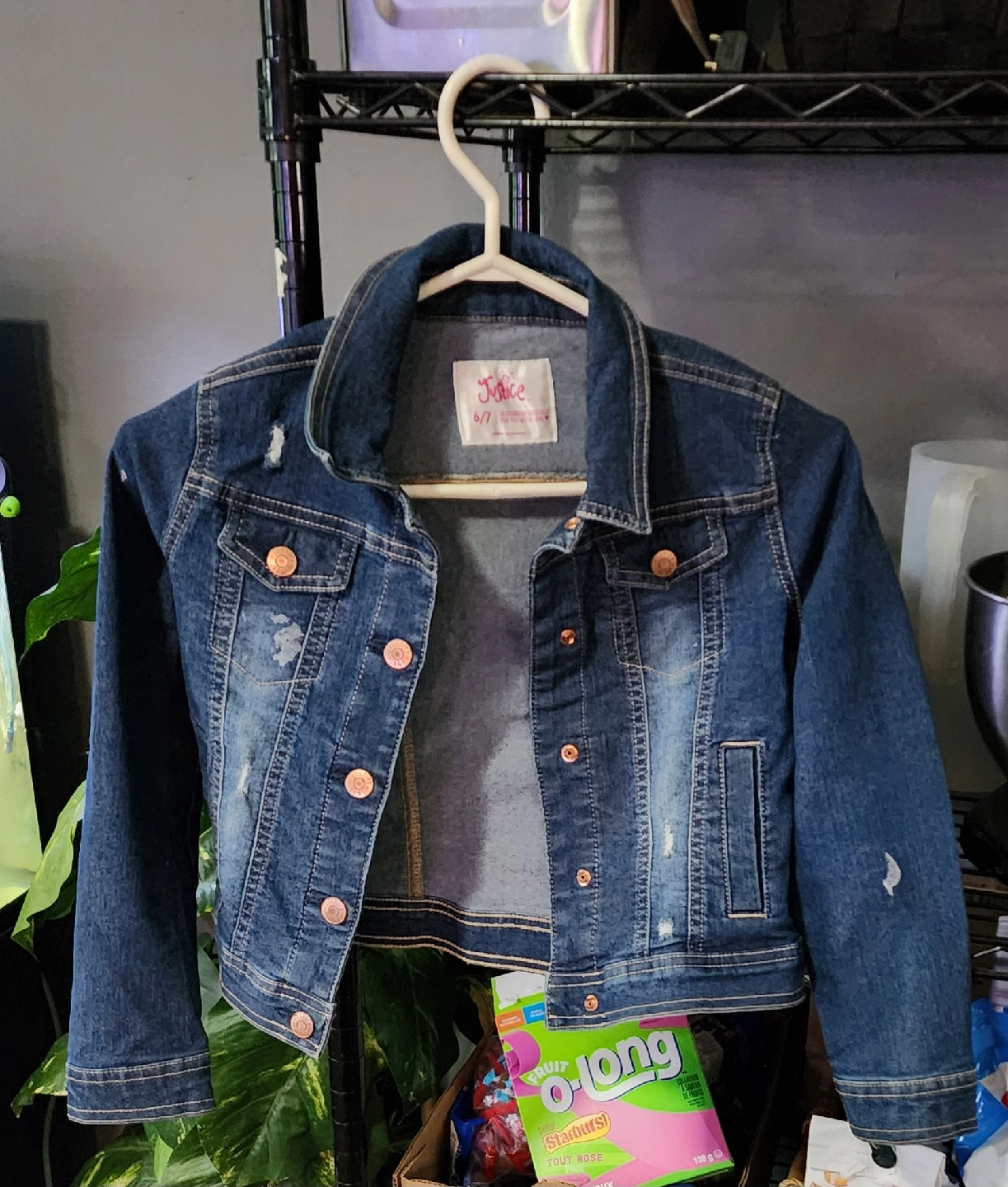 This is a cute denim jacket from Justice in size 6/7. It features a classic denim wash with copper-tone buttons and a stylish, slightly distressed look. Perfect for layering!