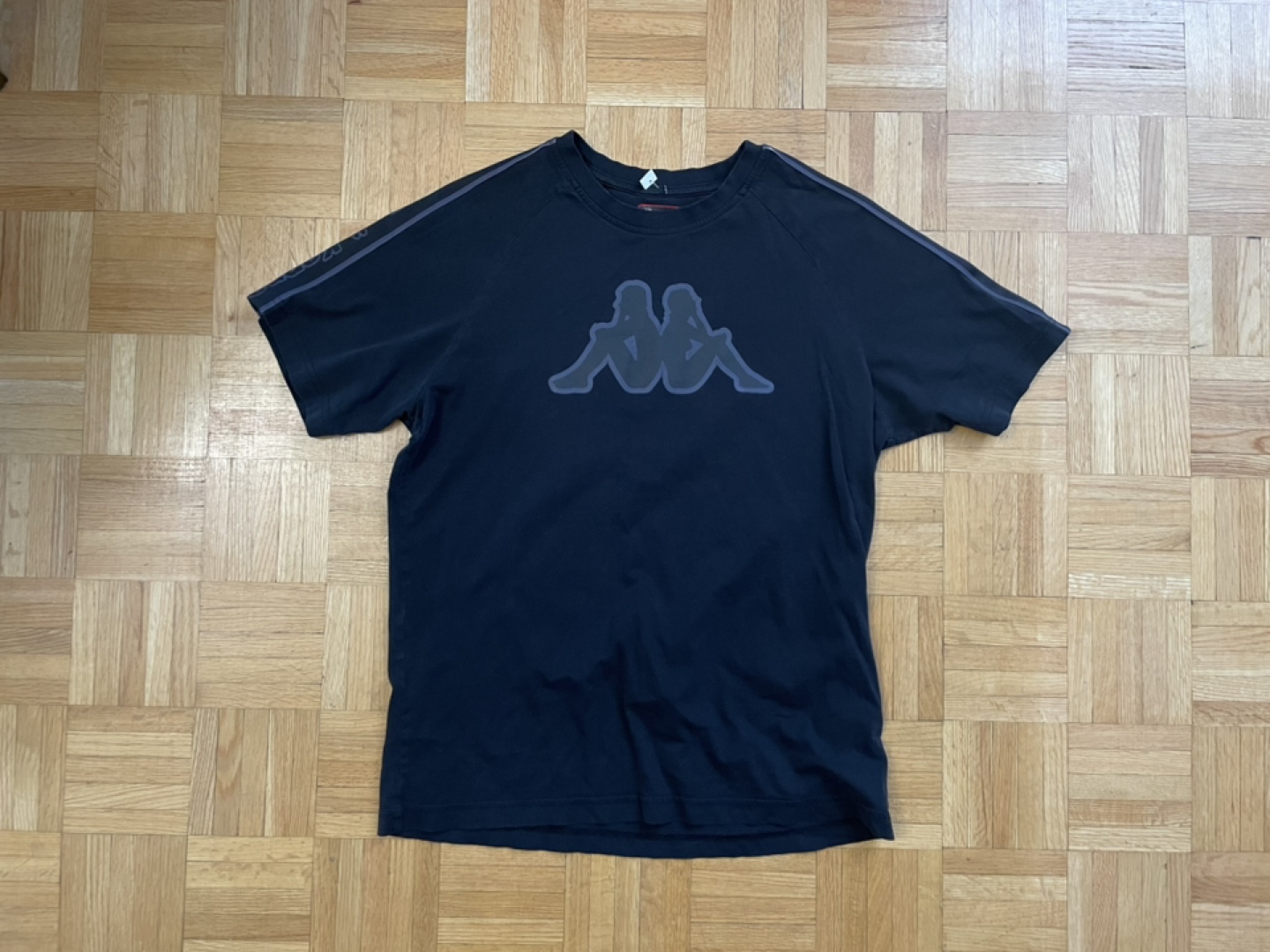 This is a black Kappa t-shirt with the iconic Kappa logo on the front and along the sleeves. It's in great condition and ready for a new home! Perfect for casual wear or sports activities