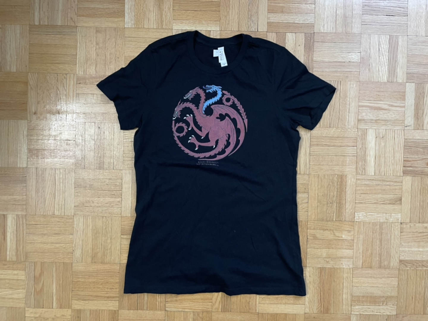 Selling a Bella + Canvas T-shirt with a Game of Thrones graphic. It's black and features a dragon design. Great for any GOT fan!
