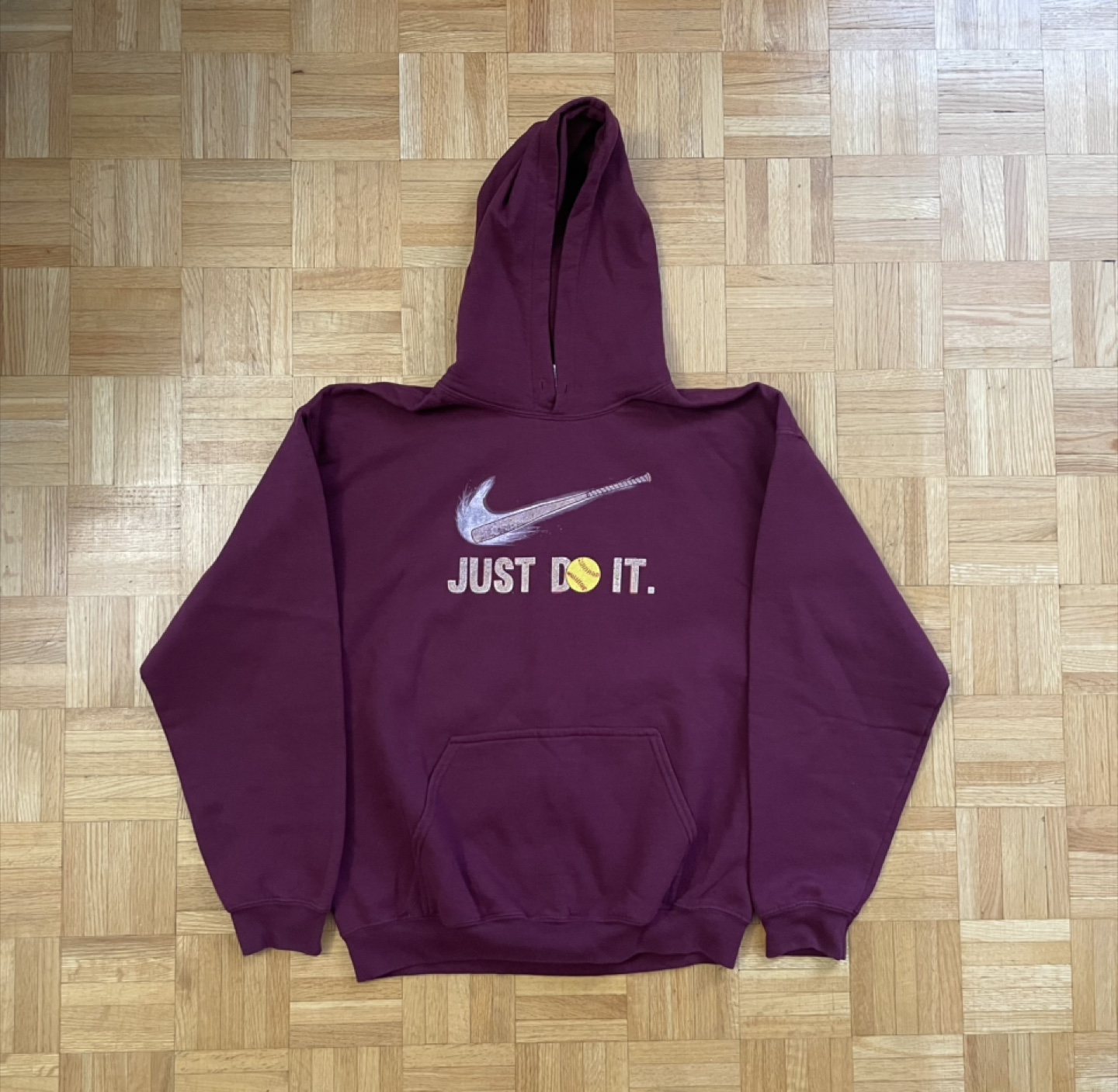 Selling a Nike hoodie in a maroon colour! It features the classic 'Just Do It' slogan with the Nike swoosh. Great for casual wear or workouts