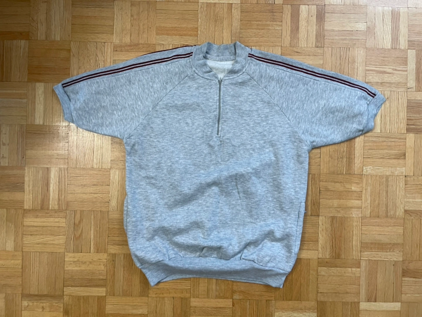 Here's a comfy grey half-zip short sleeve sweatshirt! It has a sporty look with the stripes on the sleeves. Perfect for a casual day out or just lounging around the house