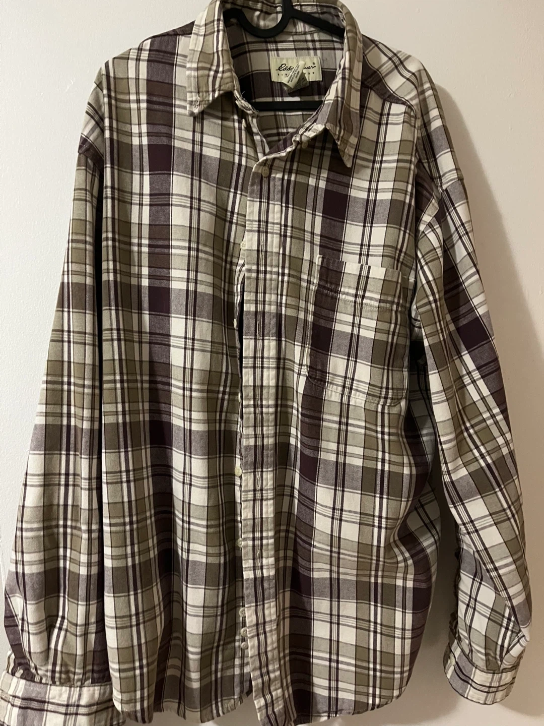 Selling an Eddie Bauer flannel shirt in size XL. It features a classic plaid pattern in neutral tones. Made from 100% cotton, it's a comfortable and versatile piece for your wardrobe!