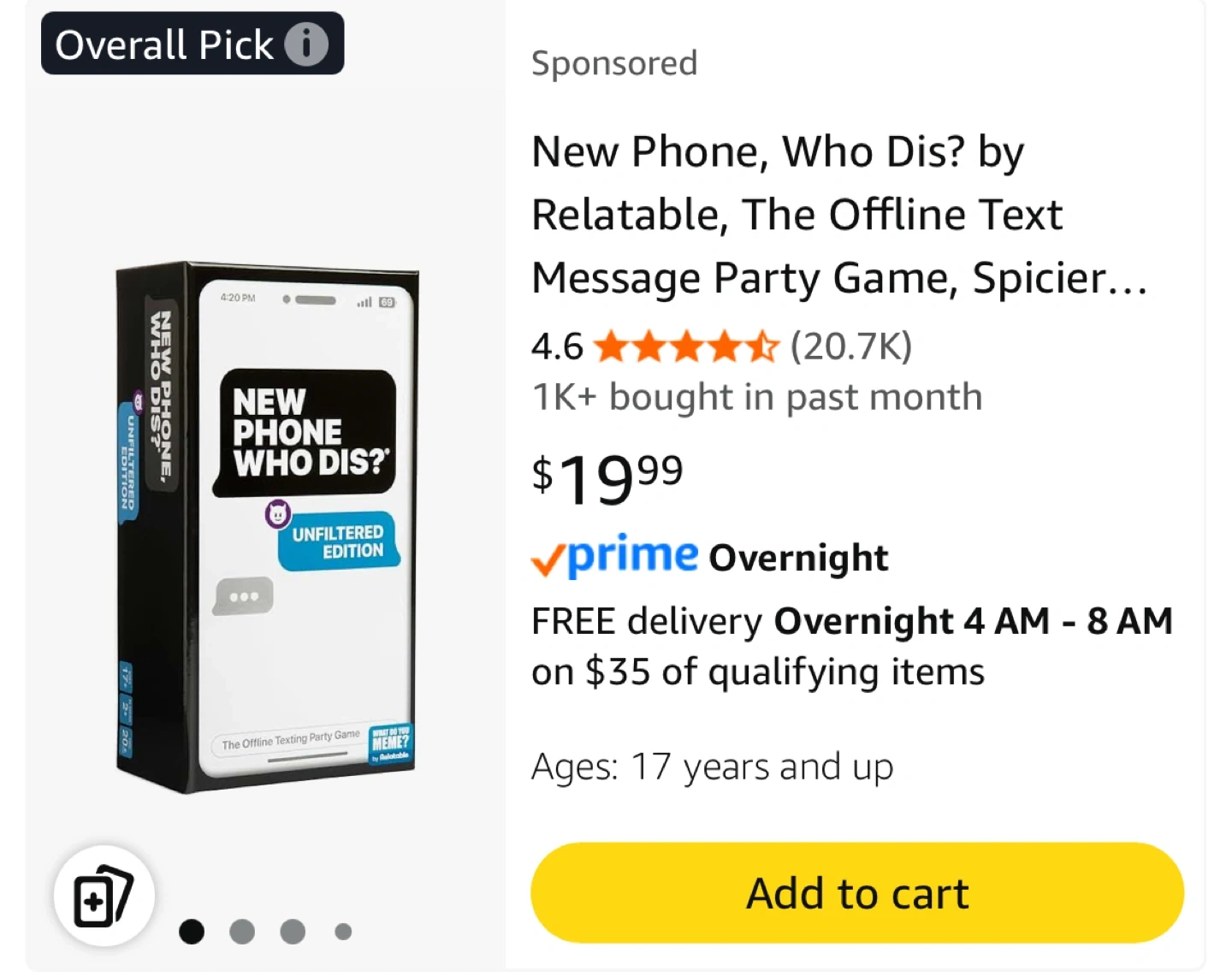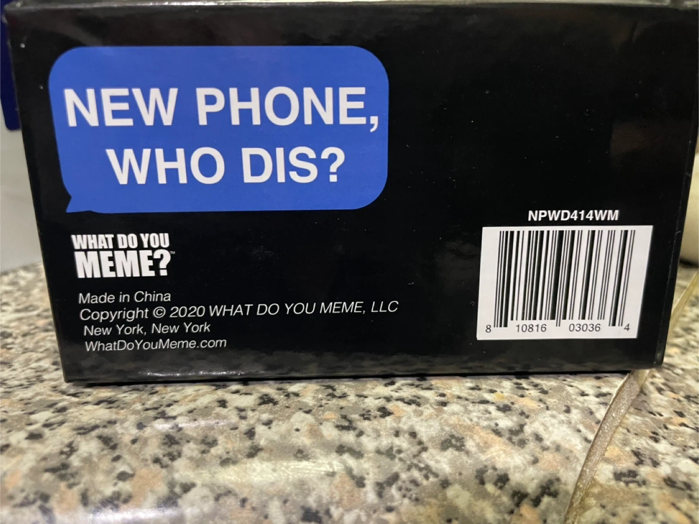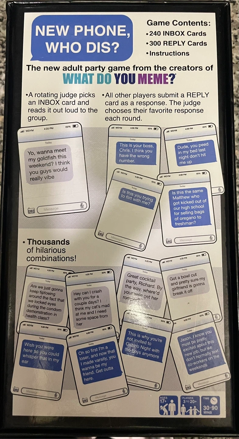 Selling the "New Phone, Who Dis?" game by What Do You Meme? It's the Unfiltered Edition for ages 17 and up. Includes 240 Inbox Cards and 300 Reply Cards, plus instructions. Great for an adult party game!