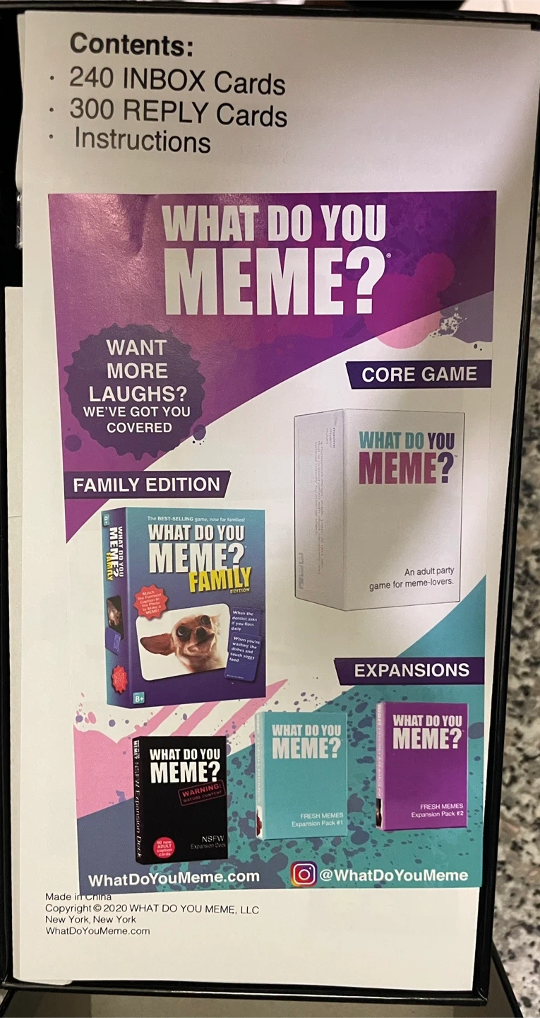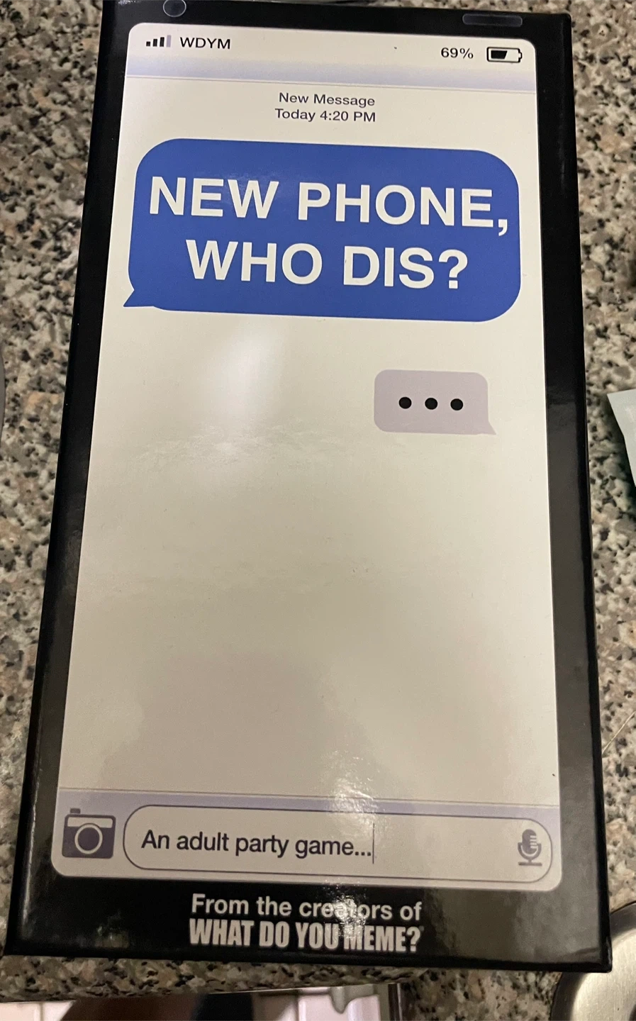Selling the "New Phone, Who Dis?" game by What Do You Meme? It's the Unfiltered Edition for ages 17 and up. Includes 240 Inbox Cards and 300 Reply Cards, plus instructions. Great for an adult party game!